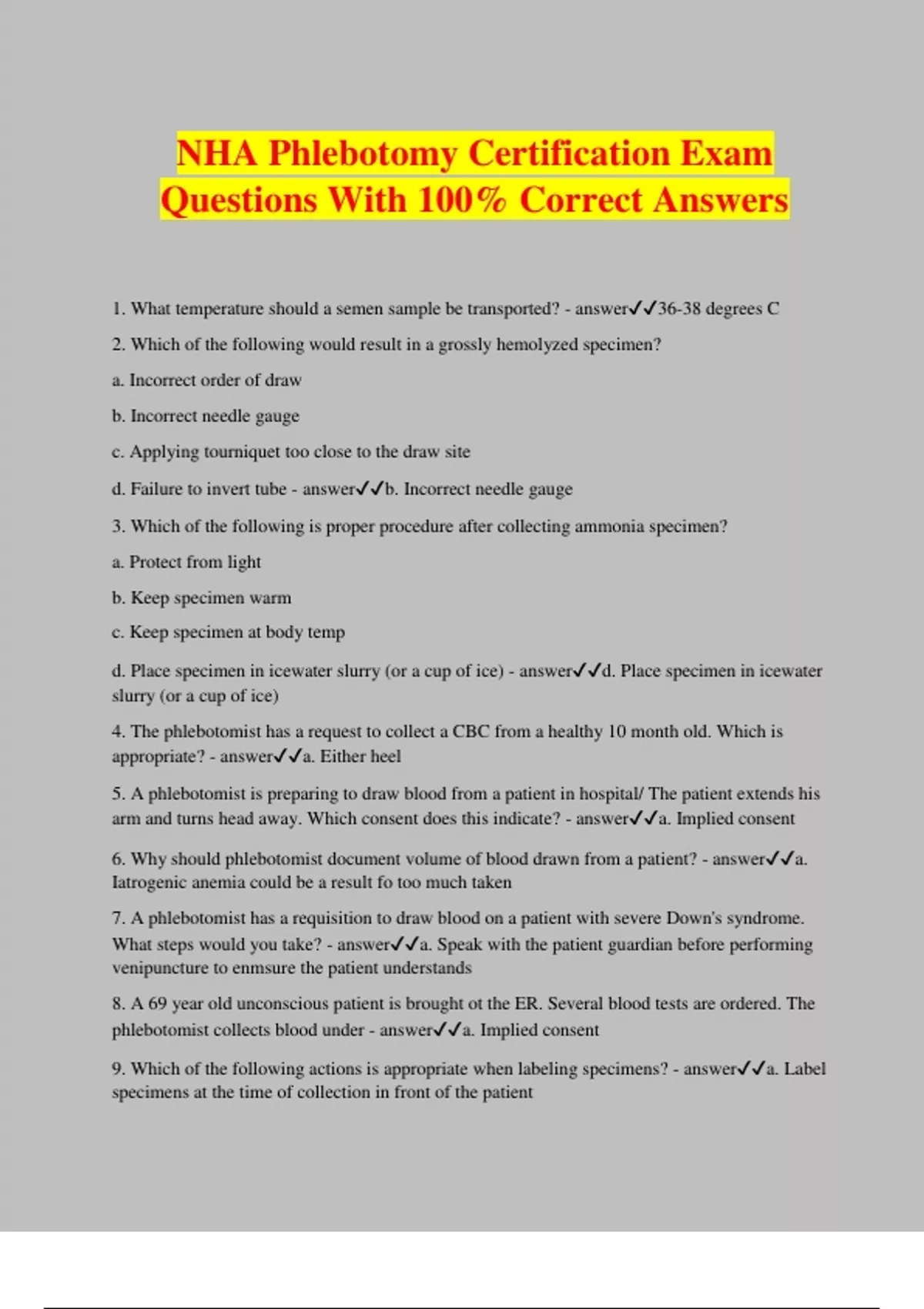 NHA Phlebotomy Certification Exam Questions With 100% Correct Answers 1. What temperature should a semen sample be transported? - answer36-38 degrees C 2. Which of the following would result in a grossly hemolyzed specimen? a. Incorrect order of draw b. Incorrect needle gauge c. Applying tourniquet too close to the draw site d. Failure to invert tube - answerb. Incorrect needle gauge 3. Which of the following is proper procedure after collecting ammonia specimen? a. Protect from light b. Keep specimen warm c. Keep specimen at body temp d. Place specimen in icewater slurry (or a cup of ice) - answerd. Place specimen in icewater slurry (or a cup of ice) 4. The phlebotomist has a request to collect a CBC from a healthy 10 month old. Which is appropriate? - answera. Either heel 5. A phlebotomist is preparing to draw blood from a patient in hospital/ The patient extends his arm and turns head away. Which consent does this indicate? - answera. Implied consent 6. Why should phlebotomist document volume of blood drawn from a patient? - answera. Iatrogenic anemia could be a result fo too much taken 7. A phlebotomist has a requisition to draw blood on a patient with severe Down's syndrome. What steps would you take? - answera. Speak with the patient guardian before performing venipuncture to enmsure the patient understands 8. A 69 year old unconscious patient is brought ot the ER. Several blood tests are ordered. The phlebotomist collects blood under - answera. Implied consent 9. Which of the following actions is appropriate when labeling specimens? - answera. Label specimens at the time of collection in front of the patient 10. Before collecting blood on an inpatient, the phlebotomist notices there's no wristband on wrist. There is one on the IV pole. What do you do? - answera. Don't draw until nurse puts an armband on patient 11. Which is appropriate form of identification in inpatient setting? - answera. Verbal and wrist band 12. WBC, RBC, Electrolytes are ordered. Which tubes are used for capillary? - answera. Lavender and red 13. A blood specimen is rejected by lab with QNS as the reason? Why? - answera. The specimen was insufficient-not enough blood 14. Which of the following is best method to prevent internal or external bleeding from venipuncture site after needle is removed? - answera. Apply pressure to prevent leakage of blood into the tissues 15. A physician orders a STAT but phlebotomist forgets to fill out patient ID number. What is appropriate procedure for an improperly labeled specimen when received in lab? - answera. Lab rejects the mislabeled specimen 16. Phlebotomist is performing venipuncture and patient begins to seize. What is correct action? - answera. Discontinue the draw 17. Phlebotomist receives orders to draw an infant screening card, O2 levels, bilirubin, and DNA. Which is to be drawn first? - answera. O2 levels 18. When performing a venipuncture on a patient of average weight, which is the correct technique for needle insertion? - answera. Insert until a change in resistance 19. Which is the best method to collect a blood specimen from an older adult patient who has fragile, easy to collapse veins? - answera. Choose a syringe and butterfly assembly 20. Which of the following is the term for donation of a patient's own blood for an upcoming surgery? - answera. Autologous donation 21. The order of draw for capillary collections is different than venipuncture because - answera. Increased risk of coagulation (remember platelets start to form) 22. Upon entering a patient's room for routine blood draw, phlebotomist notices clergy member is with the patient. What should you do? - answera. Return later after drawing other patients 23. A phlebotomist notices a hematoma developing at the site of venipuncture. The phlebotomist should - answera. Release the tourniquet and stop the draw 24. Know ORDER of DRAW!! - ans