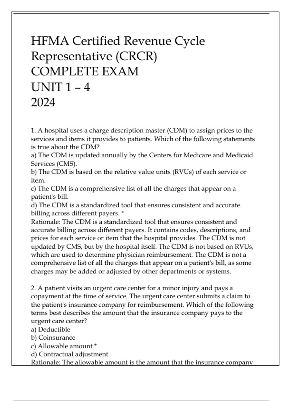 HFMA CRCR COMPLETE EXAM WITH ANSWERS & RATIONALES UNIT 1 - 4 2024
