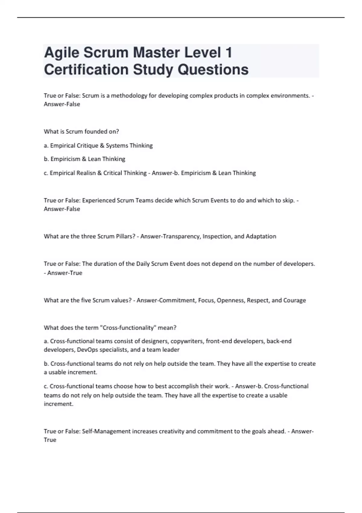 True or False: Scrum is a methodology for developing complex products in complex environments. - Answer-False What is Scrum founded on? a. Empirical Critique & Systems Thinking b. Empiricism & Lean Thinking c. Empirical Realisn & Critical Thinking - Answer-b. Empiricism & Lean Thinking True or False: Experienced Scrum Teams decide which Scrum Events to do and which to skip. - Answer-False What are the three Scrum Pillars? - Answer-Transparency, Inspection, and Adaptation True or False: The duration of the Daily Scrum Event does not depend on the number of developers. - Answer-True What are the five Scrum values? - Answer-Commitment, Focus, Openness, Respect, and Courage What does the term "Cross-functionality" mean? a. Cross-functional teams consist of designers, copywriters, front-end developers, back-end developers, DevOps specialists, and a team leader b. Cross-functional teams do not rely on help outside the team. They have all the expertise to create a usable increment. c. Cross-functional teams choose how to best accomplish their work. - Answer-b. Cross-functional teams do not rely on help outside the team. They have all the expertise to create a usable increment. True or False: Self-Management increases creativity and commitment to the goals ahead. - AnswerTrueHow does Scrum control risk? a. By using external experts who consult the Scrum Team every 3 sprints or so. b. By being a lightweight method. c. By using an iterative and incremental approach to development. - Answer-c. By using an iterative and incremental approach to development. True or False: Scrum Teams are allowed to use whatever practices, charts, and techniques they want. - Answer-True True or False: In complex environments, we do not know what will happen. Empiricism is an effective approach to help Scrum Teams deal with complexity and unknowns. - Answer-True
