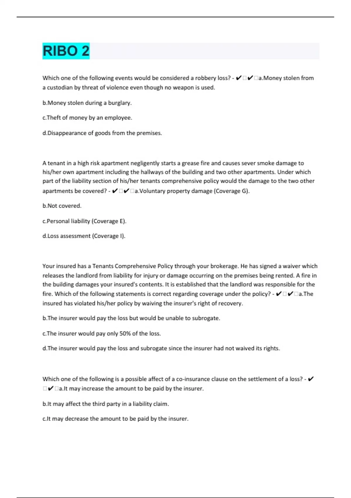 Which one of the following events would be considered a robbery loss? - ️️a.Money stolen from a custodian by threat of violence even though no weapon is used. b.Money stolen during a burglary. c.Theft of money by an employee. d.Disappearance of goods from the premises. A tenant in a high risk apartment negligently starts a grease fire and causes sever smoke damage to his/her own apartment including the hallways of the building and two other apartments. Under which part of the liability section of his/her tenants comprehensive policy would the damage to the two other apartments be covered? - ️️a.Voluntary property damage (Coverage G). b.Not covered. c.Personal liability (Coverage E). d.Loss assessment (Coverage I). Your insured has a Tenants Comprehensive Policy through your brokerage. He has signed a waiver which releases the landlord from liability for injury or damage occurring on the premises being rented. A fire in the building damages your insured's contents. It is established that the landlord was responsible for the fire. Which of the following statements is correct regarding coverage under the policy? - ️️a.The insured has violated his/her policy by waiving the insurer's right of recovery. b.The insurer would pay the loss but would be unable to subrogate. c.The insurer would pay only 50% of the loss. d.The insurer would pay the loss and subrogate since the insurer had not waived its rights. Which one of the following is a possible affect of a co-insurance clause on the settlement of a loss? - ️️a.It may increase the amount to be paid by the insurer. b.It may affect the third party in a liability claim. c.It may decrease the amount to be paid by the insurer. d.It may affect the insured's personal liability coverages.