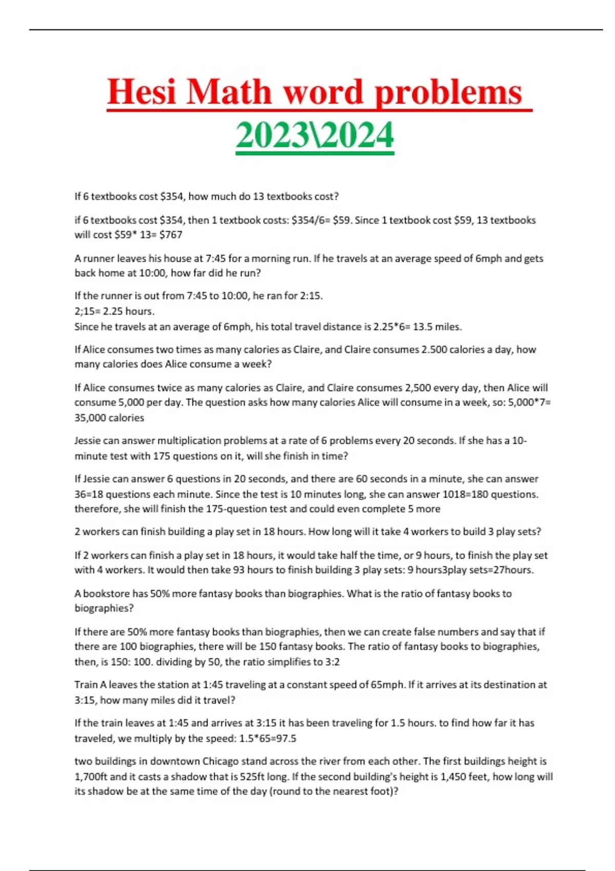 Hesi Math word problems If 6 textbooks cost $354, how much do 13 textbooks cost? if 6 textbooks cost $354, then 1 textbook costs: $354/6= $59. Since 1 textbook cost $59, 13 textbooks will cost $59* 13= $767 A runner leaves his house at 7:45 for a morning run. If he travels at an average speed of 6mph and gets back home at 10:00, how far did he run? If the runner is out from 7:45 to 10:00, he ran for 2:15