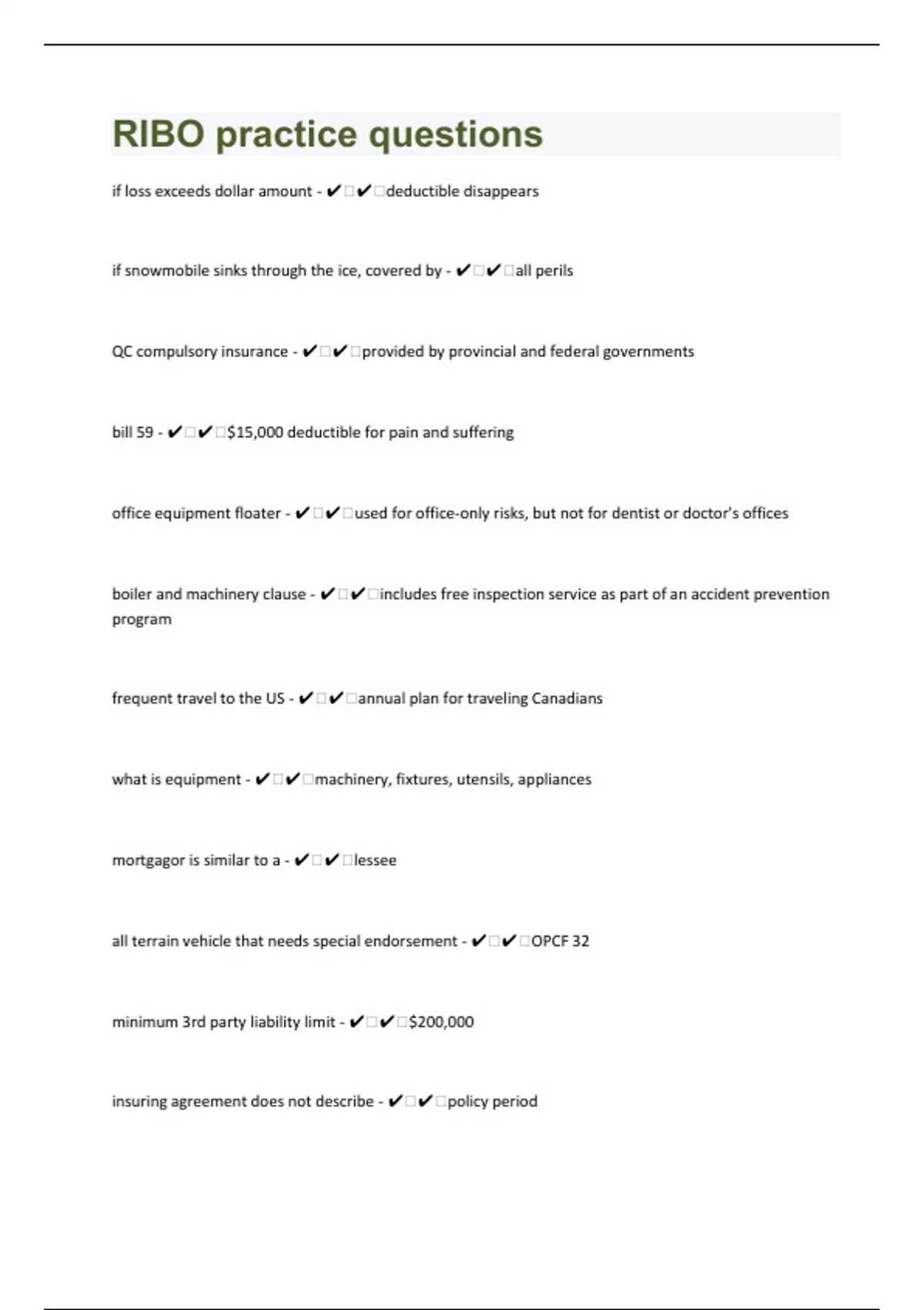 if loss exceeds dollar amount - ️️deductible disappears if snowmobile sinks through the ice, covered by - ️️all perils QC compulsory insurance - ️️provided by provincial and federal governments bill 59 - ️️$15,000 deductible for pain and suffering office equipment floater - ️️used for office-only risks, but not for dentist or doctor's offices boiler and machinery clause - ️️includes free inspection service as part of an accident prevention program frequent travel to the US - ️️annual plan for traveling Canadians what is equipment - ️️machinery, fixtures, utensils, appliances mortgagor is similar to a - ️️lessee all terrain vehicle that needs special endorsement - ️️OPCF 32 minimum 3rd party liability limit - ️️$200,000 insuring agreement does not describe - ️️policy period