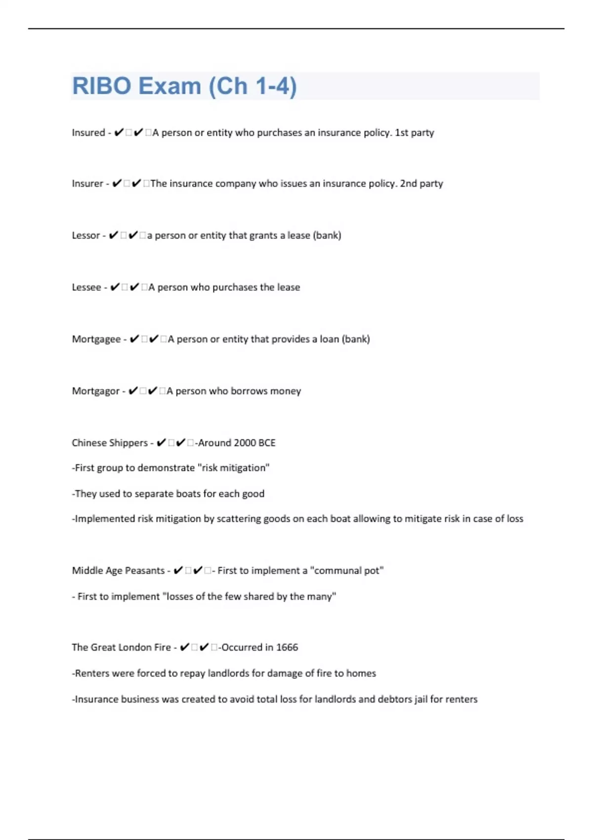 Insured - ️️A person or entity who purchases an insurance policy. 1st party Insurer - ️️The insurance company who issues an insurance policy. 2nd party Lessor - ️️a person or entity that grants a lease (bank) Lessee - ️️A person who purchases the lease Mortgagee - ️️A person or entity that provides a loan (bank) Mortgagor - ️️A person who borrows money Chinese Shippers - ️️-Around 2000 BCE -First group to demonstrate "risk mitigation" -They used to separate boats for each good -Implemented risk mitigation by scattering goods on each boat allowing to mitigate risk in case of loss Middle Age Peasants - ️️- First to implement a "communal pot" - First to implement "losses of the few shared by the many" The Great London Fire - ️️-Occurred in 1666 -Renters were forced to repay landlords for damage of fire to homes -Insurance business was created to avoid total loss for landlords and debtors jail for renters