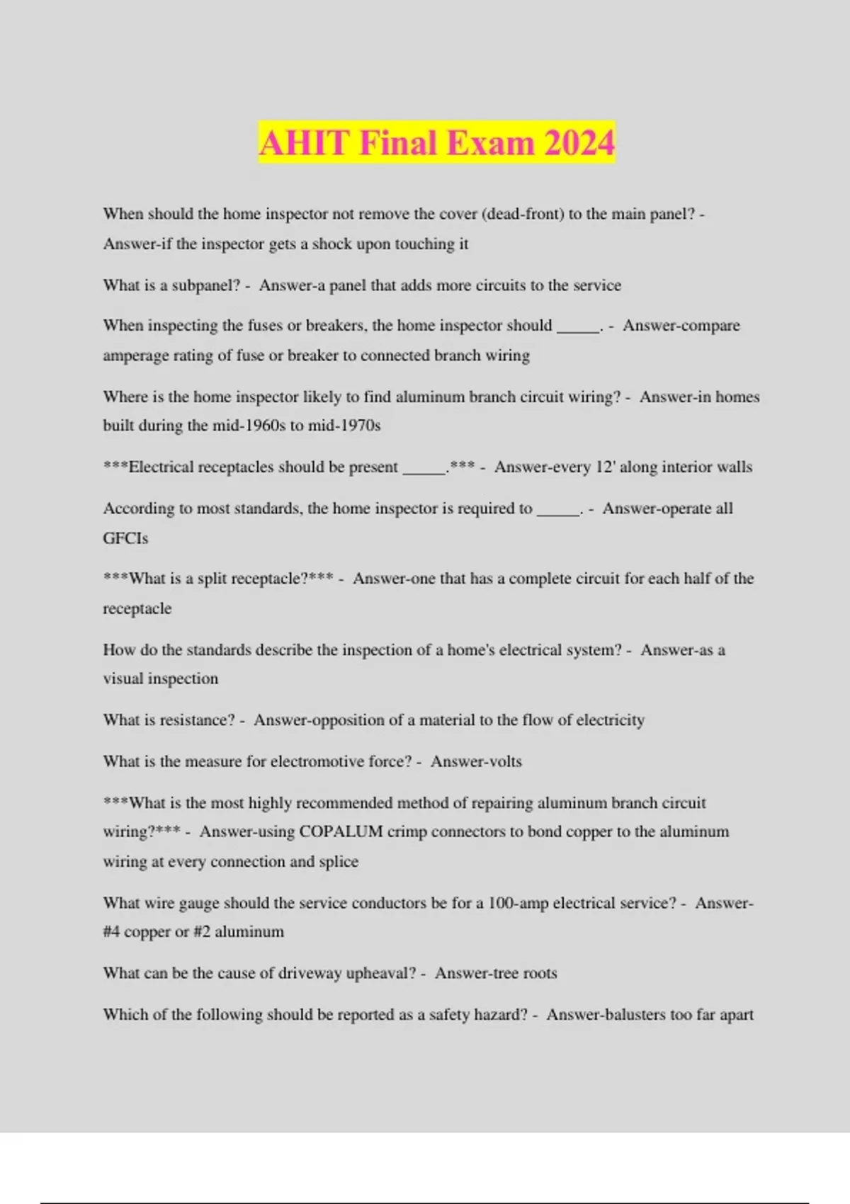 AHIT Final Exam 2024 When should the home inspector not remove the cover (dead-front) to the main panel? - Answer-if the inspector gets a shock upon touching it What is a subpanel? - Answer-a panel that adds more circuits to the service When inspecting the fuses or breakers, the home inspector should _____. - Answer-compare amperage rating of fuse or breaker to connected branch wiring Where is the home inspector likely to find aluminum branch circuit wiring? - Answer-in homes built during the mid-1960s to mid-1970s ***Electrical receptacles should be present _____.*** - Answer-every 12' along interior walls According to most standards, the home inspector is required to _____. - Answer-operate all GFCIs ***What is a split receptacle?*** - Answer-one that has a complete circuit for each half of the receptacle How do the standards describe the inspection of a home's electrical system? - Answer-as a visual inspection What is resistance? - Answer-opposition of a material to the flow of electricity What is the measure for electromotive force? - Answer-volts ***What is the most highly recommended method of repairing aluminum branch circuit wiring?*** - Answer-using COPALUM crimp connectors to bond copper to the aluminum wiring at every connection and splice What wire gauge should the service conductors be for a 100-amp electrical service? - Answer- #4 copper or #2 aluminum What can be the cause of driveway upheaval? - Answer-tree roots Which of the following should be reported as a safety hazard? - Answer-balusters too far apart Why should sources of ignition be raised 18" off the floor? - Answer-it keeps the ignition sources away from gasoline vapors When the solvent in paint evaporates too quickly, what can be the result? - Answer-alligatoring What would not be a cause of a sliding glass door rubbing during operation? - Answer-a leaking seal in the window What is the definition of a porch? - Answer-a roofed extension of the house What is the proper pitch for a patio? - Answer-pitched away from the house The most common retaining wall failure is caused by _____. - Answer-inadequate drainage The main problem with stucco is that it _____. - Answer-tends to crack How should the corner moldings on aluminum siding be installed? - Answer-the upper molding overlapping the one below A hinged door that rubs the frame during operation may have _____. - Answer-loose hinge screws Discoloration or fogging in a window is an indication of _____. - Answer-a leaking insulated glass seal What would not be the cause of a sag in a porch ceiling? - Answer-rotting fascia board What condition is usually the cause of yellow-tipped flames in a gas heating unit? - Answer-lack of combustion air What function does the draft hood or draft diverter play in a heating unit? - Answer-it protects the unit from updrafts What type of oil burner has the greatest operating efficiency? - Answer-a flame retention burner What should the home inspector do if the firebox porthole is sealed? - Answer-don't break the seal, then report that the firebox wasn't inspected What should the home inspector do if he or she finds a cracked heat exchanger? - Answer-report it as a major repair Which heating system is also called hydronic? - Answer-forced hot water The operating pressure in a forced hot water system for a typical two-story home should be _____. - Answer-12 p