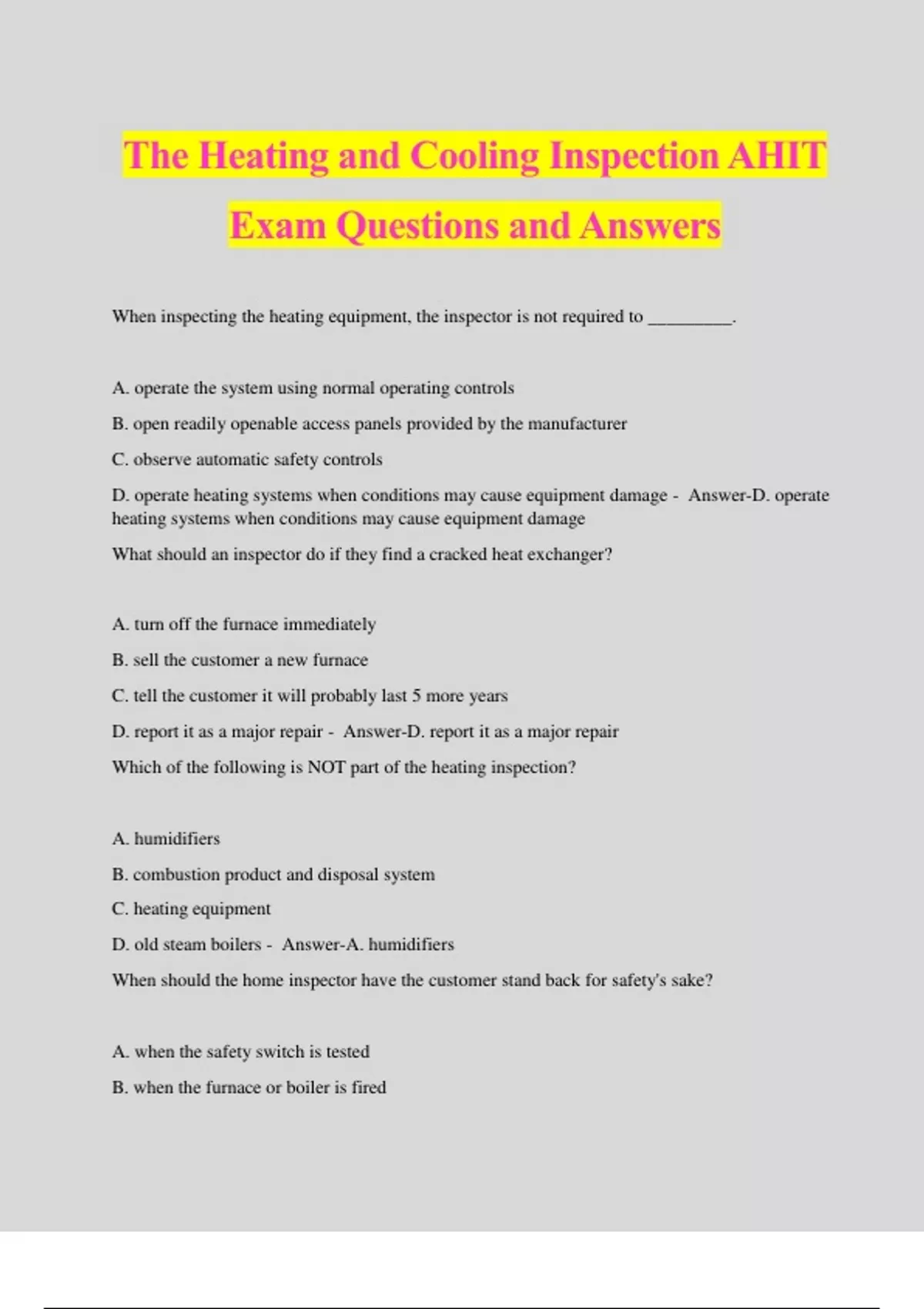 The Heating and Cooling Inspection AHIT Exam Questions and Answers When inspecting the heating equipment, the inspector is not required to _________. A. operate the system using normal operating controls B. open readily openable access panels provided by the manufacturer C. observe automatic safety controls D. operate heating systems when conditions may cause equipment damage - Answer-D. operate heating systems when conditions may cause equipment damage What should an inspector do if they find a cracked heat exchanger? A. turn off the furnace immediately B. sell the customer a new furnace C. tell the customer it will probably last 5 more years D. report it as a major repair - Answer-D. report it as a major repair Which of the following is NOT part of the heating inspection? A. humidifiers B. combustion product and disposal system C. heating equipment D. old steam boilers - Answer-A. humidifiers When should the home inspector have the customer stand back for safety's sake? A. when the safety switch is tested B. when the furnace or boiler is fired C. when the venting is inspected D. when the thermostat is manipulated - Answer-B. when the furnace or boiler is fired If a heating system appears to be improperly vented after the home inspector fires it, the inspector should ____________. A. repair the venting issue and proceed B. investigate the cause of improper venting C. turn off the system promptly D. ask the owner to inspect the venting - Answer-C. turn off the system promptly Why should a furnace not be operated? A. too much aluminum foil present to properly inspect it B. improper venting C. rusted ductwork D. a masonry chimney - Answer-B. improper venting What is overshooting? A. a condition where a house is heated higher than the thermostat is set for B. a condition where the thermostat is not level, causing incorrect temperature readings C. a condition where different zones of a house are controlled by different thermostats D. a condition where the heating system turns on and off too frequently - Answer-A. a condition where a house is heated higher than the thermostat is set for What type of central heating system is always required to have a remote safety switch? A. oil-fired B. electric furnace C. gas-fired D. heat pump - Answer-A. oil-fired An 80% efficiency rating for a gas-fired heating system would best describe ___________. A. a conventional system B. a high-efficiency system C. a mid-efficiency system D. a middle of the road system - Answer-C. a mid-efficiency system The gas manifold in a gas-fired heating system delivers gas ___________. A. from the meter to the turn-off valve above the heating unit B. from the gas valve to the burners C. from the pilot control valve to the pilot D. from the drip leg to the gas valve - Answer-B. from the gas valve to the burners What is the purpose of the high limit control on a forced warm air furnace? A. it turns off the burners if the furnace hits a preset high temperature B. it turns off the fan when the furnace reaches a preset low temperature C. it heats the air D. it turns on the fan when the furnace hits a preset high temperature - Answer-A. it turns off the burners if the furnace hits a preset high temperature What is a thermocouple? A. a combination control containing the gas valve and pilot valve B. a device that senses whether the pilot is lighted and controls the flow of gas to the burners C. an automatic valve that starts and stops the flow of gas to the burners D. a glow coil or electric spark that is energized by the thermostat to ignite the gas - Answer-B. a device that senses whether the pilot is lighted and controls the flow of gas to the burners What is NOTa function of the automatic gas valve on a gas burner? A. to respond to the limit control to stop gas flow to the burners during a malfunction B. to respond to the thermostat to start and stop gas flow to the burners C. to meter the gas stream for volume and pressure to the burners D. to sense whether the pilot is lighted - Answer-D. to sense whether the pilot is lighted What condition is usually the cause of yellow-tipped flames in a gas heating unit? A. gas/air mixture flow velocity greater than the burn rate B. lack of combustion air C. gas/air mixture flow velocity less than the burn rate D. lack of draft air - Answer-B. lack of combustion air What pattern flame would NOT necessarily cause CO