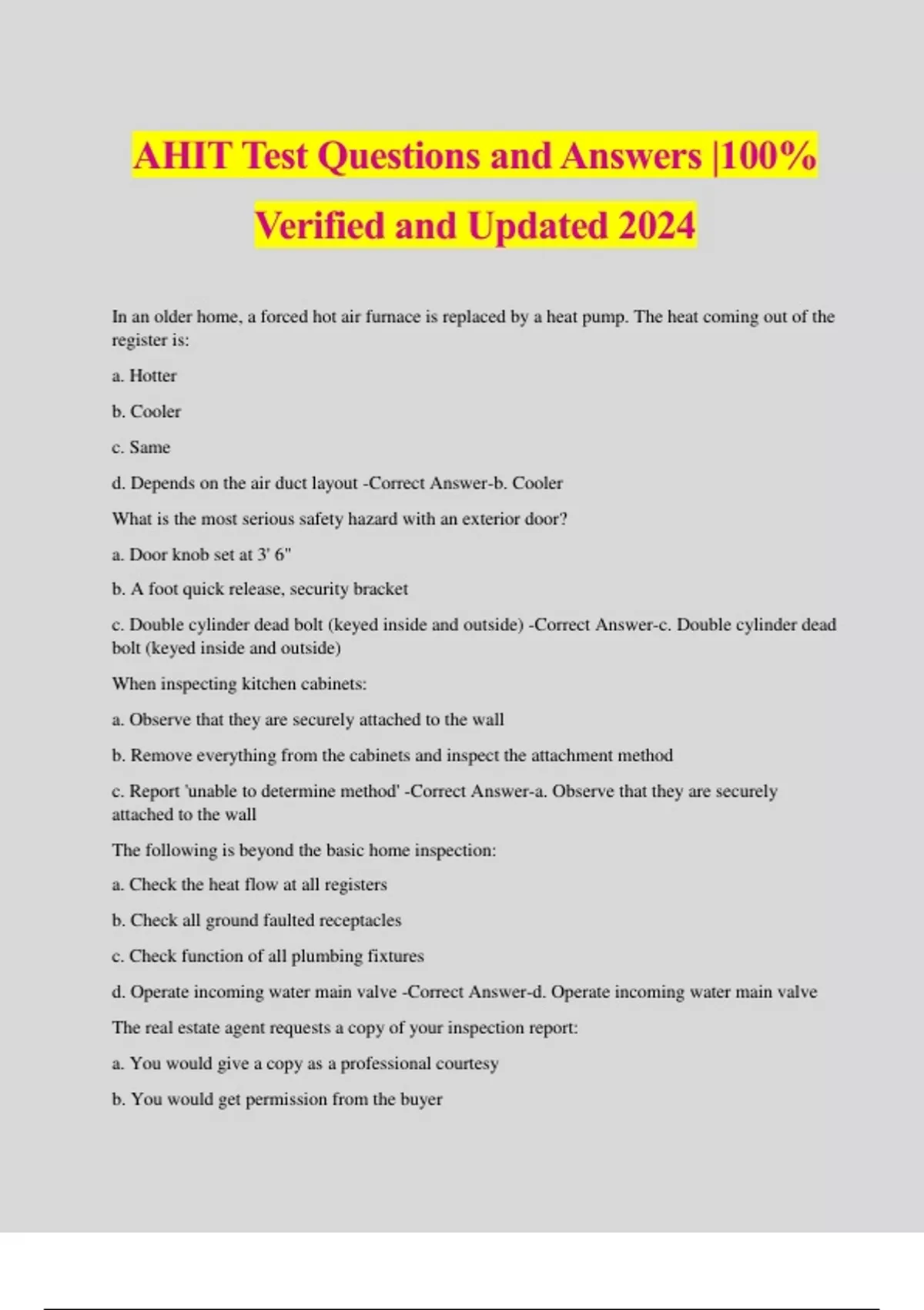 AHIT Test Questions and Answers |100% Verified and Updated 2024 In an older home, a forced hot air furnace is replaced by a heat pump. The heat coming out of the register is: a. Hotter b. Cooler c. Same d. Depends on the air duct layout -Correct Answer-b. Cooler What is the most serious safety hazard with an exterior door? a. Door knob set at 3' 6" b. A foot quick release, security bracket c. Double cylinder dead bolt (keyed inside and outside) -Correct Answer-c. Double cylinder dead bolt (keyed inside and outside) When inspecting kitchen cabinets: a. Observe that they are securely attached to the wall b. Remove everything from the cabinets and inspect the attachment method c. Report 'unable to determine method' -Correct Answer-a. Observe that they are securely attached to the wall The following is beyond the basic home inspection: a. Check the heat flow at all registers b. Check all ground faulted receptacles c. Check function of all plumbing fixtures d. Operate incoming water main valve -Correct Answer-d. Operate incoming water main valve The real estate agent requests a copy of your inspection report: a. You would give a copy as a professional courtesy b. You would get permission from the buyer c. You would never give a copy to a Realtor. -Correct Answer-b. You would get permission from the buyer On the interior door leading to the attached garage, the door: a. Must swing into the garage b. Must have self-closing hinges c. Must have metal on the garage side d. Must be 1 3/8" thick wood, metal, or fire-rated -Correct Answer-d. Must be 1 3/8" thick wood, metal, or fire-rated A house is built on a sloping hill. The surface water should be drained a. Directly into the sump pump b. Into a 4-inch perforated plastic drain line and directed downhill to daylight c. Into a gravel filled container (inside the basement) d. Drained laterally. -Correct Answer-b. Into a 4-inch perforated plastic drain line and directed downhill to daylight A flat roof with a two-foot surrounding parapet wall, what must be provided to allow drainage: a. Gutters b. Scuppers c. Roof drain with secondary overflow drain d. Either b or c above -Correct Answer-d. Either b or c above A deck is 4 feet off the ground and you note that the ledger board has four 16d nails in each bay: a. Tell the buyer that proper bolts should be installed b. Should add more 16d nails c. Place another 2x10, nailed under the ledger board d. Don't buy the house -Correct Answer-a. Tell the buyer that proper bolts should be installed You are inspecting a house where the second-story balcony is observed and every cantilevered joist is rotted halfway out from the wall. a. Tell all appropriate parties that there is a hazard, and no one should step out on it. b. Say nothing c. Tell the client of the problem and report as such. d. Contact the city building inspector and let them know of the problem. -Correct Answer-a. Tell all appropriate parties that there is a hazard, and no one should step out on it. What is a common reason for water overflowing a gutter? a. Roof too steep for the gutter system design. b. Downspout too small for the gutters. c. Gutter not large enough for the area of roof covered. d. None of the above -Correct Answer-c. Gutter not large enough for the area of roof covered. How can you determine if a home is on sinking soil or on unsteady soil? a. The streets and sidewalks in an older community are broken up. b. Only a geotechnical evaluation can make that kind of determination. c. You should make that conclusion from a standard home inspection. -Correct Answer-b. Only a geotechnical evaluation can make that kind of determination. Why would you install a pressure regulator? a. You are near a fire main. b. The pressure in the home is too high. c. You do not have enough water pressur