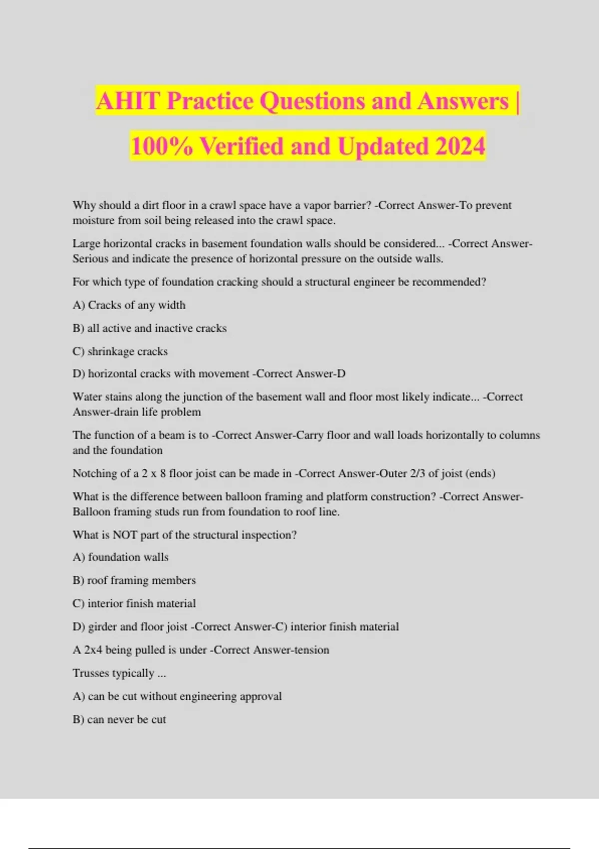 AHIT Practice Questions and Answers | 100% Verified and Updated 2024 Why should a dirt floor in a crawl space have a vapor barrier? -Correct Answer-To prevent moisture from soil being released into the crawl space. Large horizontal cracks in basement foundation walls should be considered... -Correct Answer- Serious and indicate the presence of horizontal pressure on the outside walls. For which type of foundation cracking should a structural engineer be recommended? A) Cracks of any width B) all active and inactive cracks C) shrinkage cracks D) horizontal cracks with movement -Correct Answer-D Water stains along the junction of the basement wall and floor most likely indicate... -Correct Answer-drain life problem The function of a beam is to -Correct Answer-Carry floor and wall loads horizontally to columns and the foundation Notching of a 2 x 8 floor joist can be made in -Correct Answer-Outer 2/3 of joist (ends) What is the difference between balloon framing and platform construction? -Correct Answer- Balloon framing studs run from foundation to roof line. What is NOT part of the structural inspection? A) foundation walls B) roof framing members C) interior finish material D) girder and floor joist -Correct Answer-C) interior finish material A 2x4 being pulled is under -Correct Answer-tension Trusses typically ... A) can be cut without engineering approval B) can never be cut C) have two bearing points D) are not used -Correct Answer-C) have two bearing points What does EIFS stand for? -Correct Answer-exterior insulated finish systems Most building codes allow balusters on railings to be a maximum of how far apart? -Correct Answer-4 inches What are 4 types of roof systems? -Correct Answer-hip gable gambrel mansard What contributes to moss on the exterior of a home? -Correct Answer-shade The inspector should only walk on the roof if -Correct Answer-It is safe and will not damage the roof covering. Asphalt shingles can be installed on pitches as low as ?/12 if the roof is first covered with non- perforated saturated felt paper. -Correct Answer-2/12 What is the average life expectancy of a 235 lb asphalt shingle? -Correct Answer-15-20 years The proper exposure for 18" and 24" shingles is -Correct Answer-7.5" and 10", respectively It is preferable to put wood shingles and shakes over what type of roof sheathing to allow them to dry more quickly? -Correct Answer-spaced What contributes to ice damming? -Correct Answer-inadequate or improperly installed attic insulation and ventilation What copper pipe is the lightest? -Correct Answer-M Which type of supply pipe will rust from the inside out? -Correct Answer-galvanized Water flow - relates to volume (gpm) if water pressure is low, water flow will be ____ -Correct Answer-low ?? - relates to the push behind the flow (psi). _______ may be good but the flow could be poor due to dirty water conditioning filters, constricted pipes, wrong size pipes, partially closed valves, etc. -Correct Answer-Water pressu