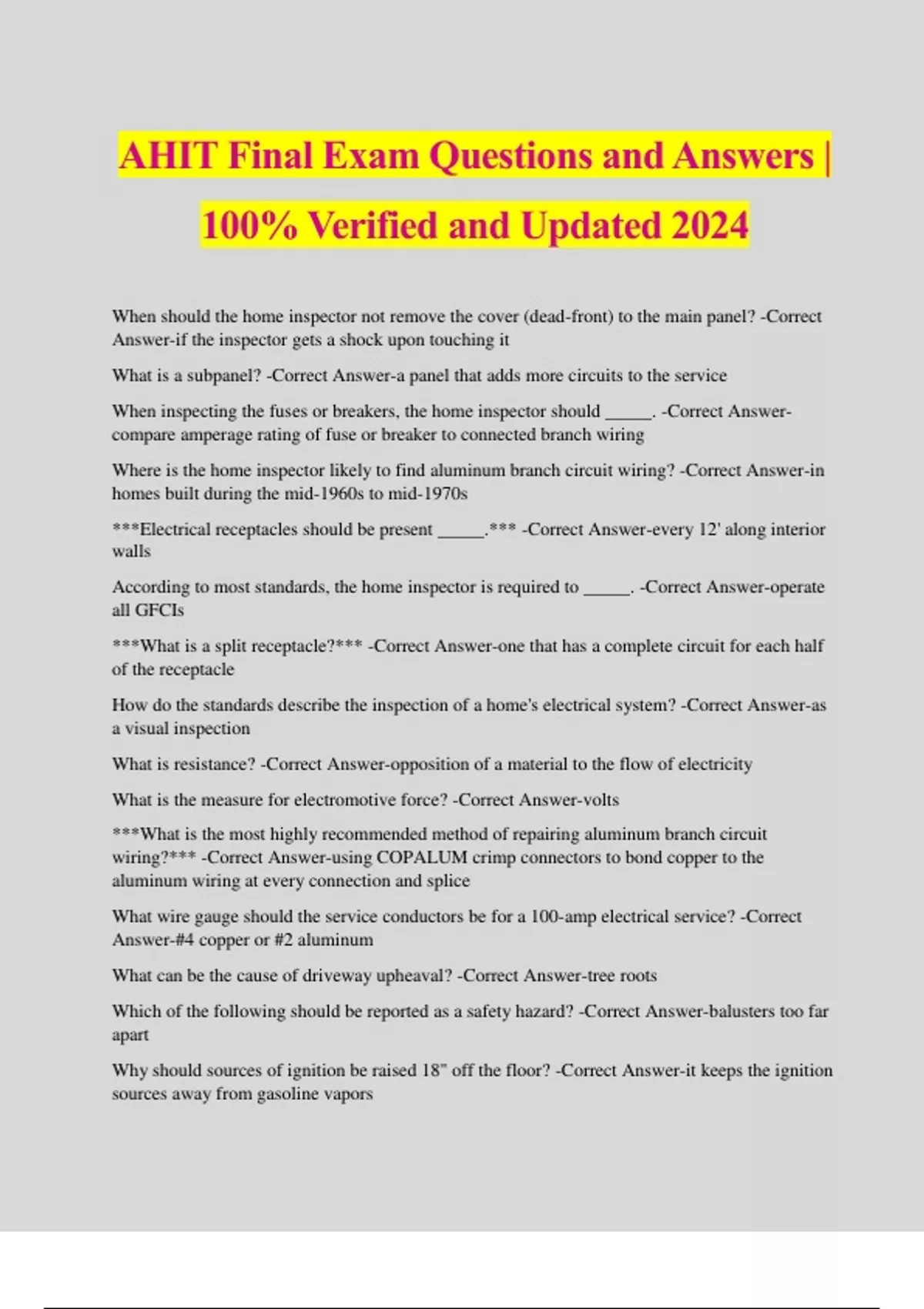 AHIT Final Exam Questions and Answers | 100% Verified and Updated 2024 When should the home inspector not remove the cover (dead-front) to the main panel? -Correct Answer-if the inspector gets a shock upon touching it What is a subpanel? -Correct Answer-a panel that adds more circuits to the service When inspecting the fuses or breakers, the home inspector should _____. -Correct Answer- compare amperage rating of fuse or breaker to connected branch wiring Where is the home inspector likely to find aluminum branch circuit wiring? -Correct Answer-in homes built during the mid-1960s to mid-1970s ***Electrical receptacles should be present _____.*** -Correct Answer-every 12' along interior walls According to most standards, the home inspector is required to _____. -Correct Answer-operate all GFCIs ***What is a split receptacle?*** -Correct Answer-one that has a complete circuit for each half of the receptacle How do the standards describe the inspection of a home's electrical system? -Correct Answer-as a visual inspection What is resistance? -Correct Answer-opposition of a material to the flow of electricity What is the measure for electromotive force? -Correct Answer-volts ***What is the most highly recommended method of repairing aluminum branch circuit wiring?*** -Correct Answer-using COPALUM crimp connectors to bond copper to the aluminum wiring at every connection and splice What wire gauge should the service conductors be for a 100-amp electrical service? -Correct Answer-#4 copper or #2 aluminum What can be the cause of driveway upheaval? -Correct Answer-tree roots Which of the following should be reported as a safety hazard? -Correct Answer-balusters too far apart Why should sources of ignition be raised 18" off the floor? -Correct Answer-it keeps the ignition sources away from gasoline vapors
