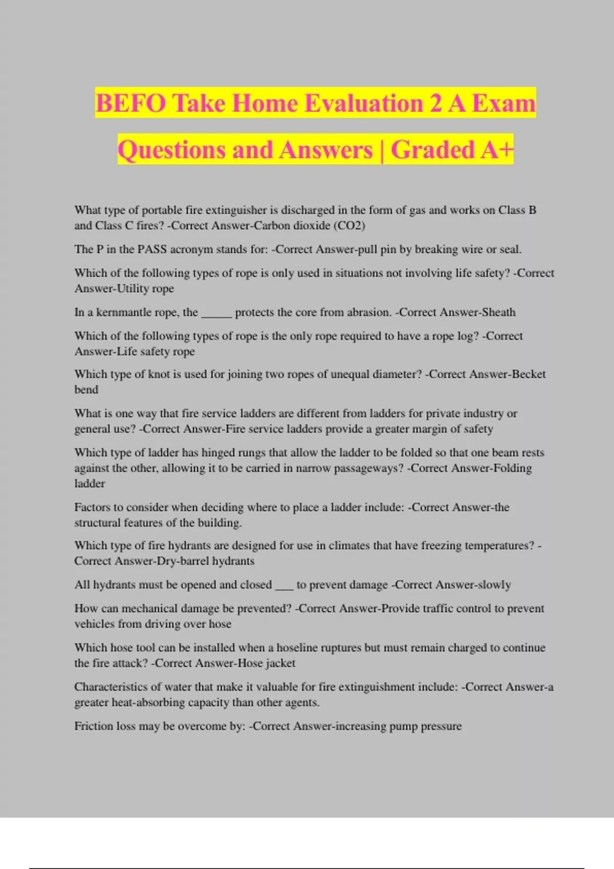BEFO Take Home Evaluation 2 A Exam Questions and Answers | Graded A+ What type of portable fire extinguisher is discharged in the form of gas and works on Class B and Class C fires? -Correct Answer-Carbon dioxide (CO2) The P in the PASS acronym stands for: -Correct Answer-pull pin by breaking wire or seal. Which of the following types of rope is only used in situations not involving life safety? -Correct Answer-Utility rope In a kernmantle rope, the _____ protects the core from abrasion. -Correct Answer-Sheath Which of the following types of rope is the only rope required to have a rope log? -Correct Answer-Life safety rope Which type of knot is used for joining two ropes of unequal diameter? -Correct Answer-Becket bend What is one way that fire service ladders are different from ladders for private industry or general use? -Correct Answer-Fire service ladders provide a greater margin of safety Which type of ladder has hinged rungs that allow the ladder to be folded so that one beam rests against the other, allowing it to be carried in narrow passageways? -Correct Answer-Folding ladder Factors to consider when deciding where to place a ladder include: -Correct Answer-the structural features of the building.