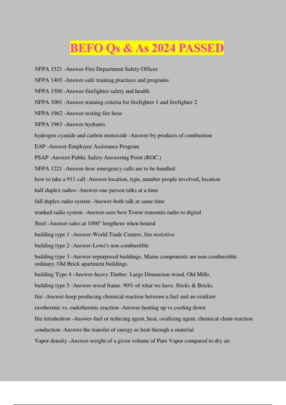 BEFO Qs & As 2024 PASSED NFPA 1521 -Answer-Fire Department Safety Officer NFPA 1403 -Answer-safe training practices and programs NFPA 1500 -Answer-firefighter safety and health NFPA 1001 -Answer-training criteria for firefighter 1 and firefighter 2 NFPA 1962 -Answer-testing fire hose NFPA 1963 -Answer-hydrants hydrogen cyanide and carbon monoxide -Answer-by products of combustion EAP -Answer-Employee Assistance Program PSAP -Answer-Public Safety Answering Point (ROC.) NFPA 1221 -Answer-how emergency calls are to be handled how to take a 911 call -Answer-location, type, number people involved, location half duplex radios -Answer-one person talks at a time full duplex radio system -Answer-both talk at same time trunked radio system -Answer-uses best Tower transmits radio to digital Steel -Answer-sales at 1000° lengthens when heated building type 1 -Answer-World Trade Centers, fire restistive building type 2 -Answer-Lowe's non combustible building type 3 -Answer-repurposed buildings, Maine components are non-combustible. ordinary. Old Brick apartment buildings. building Type 4 -Answer-heavy Timber. Large Dimension wood. Old Mills. building type 5 -Answer-wood frame. 90% of what we have. Sticks & Bricks. fire -Answer-keep producing chemical reaction between a fuel and an oxidizer exothermic vs. endothermic reaction -Answer-heating up vs cooling down
