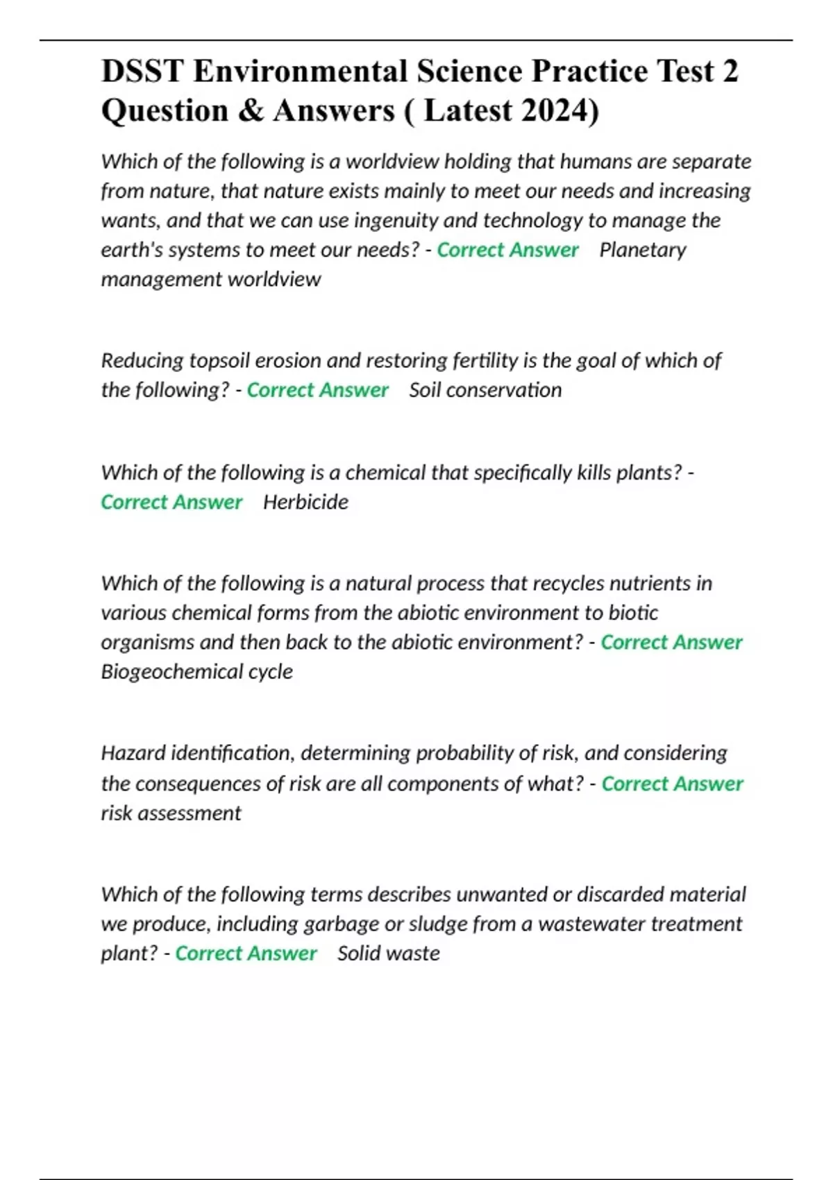 DSST Environmental Science Practice Test 2 Question & Answers ( Latest 2024)