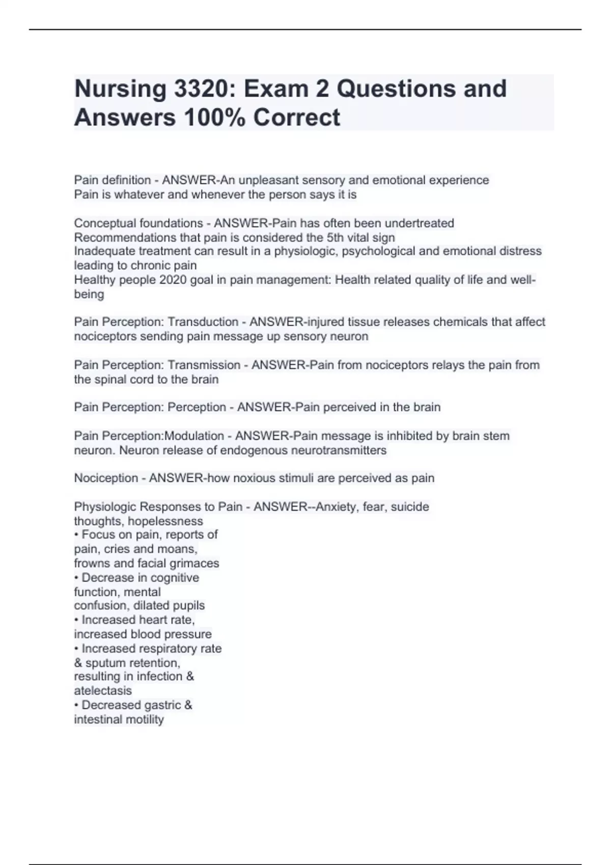 Nursing 3320: Exam 2 Questions and Answers 100% CorrectNursing 3320: Exam 2 Questions and Answers 100% CorrectNursing 3320: Exam 2 Questions and Answers 100% CorrectNursing 3320: Exam 2 Questions and Answers 100% CorrectPain definition - ANSWER-An unpleasant sensory and emotional experience Pain is whatever and whenever the person says it is Conceptual foundations - ANSWER-Pain has often been undertreated Recommendations that pain is considered the 5th vital sign Inadequate treatment can result in a physiologic, psychological and emotional distress leading to chronic pain Healthy people 2020 goal in pain management: Health related quality of life and well-being Pain Perception: Transduction - ANSWER-injured tissue releases chemicals that affect nociceptors sending pain message up sensory neuron Pain Perception: Transmission - ANSWER-Pain from nociceptors relays the pain from the spinal cord to the brain