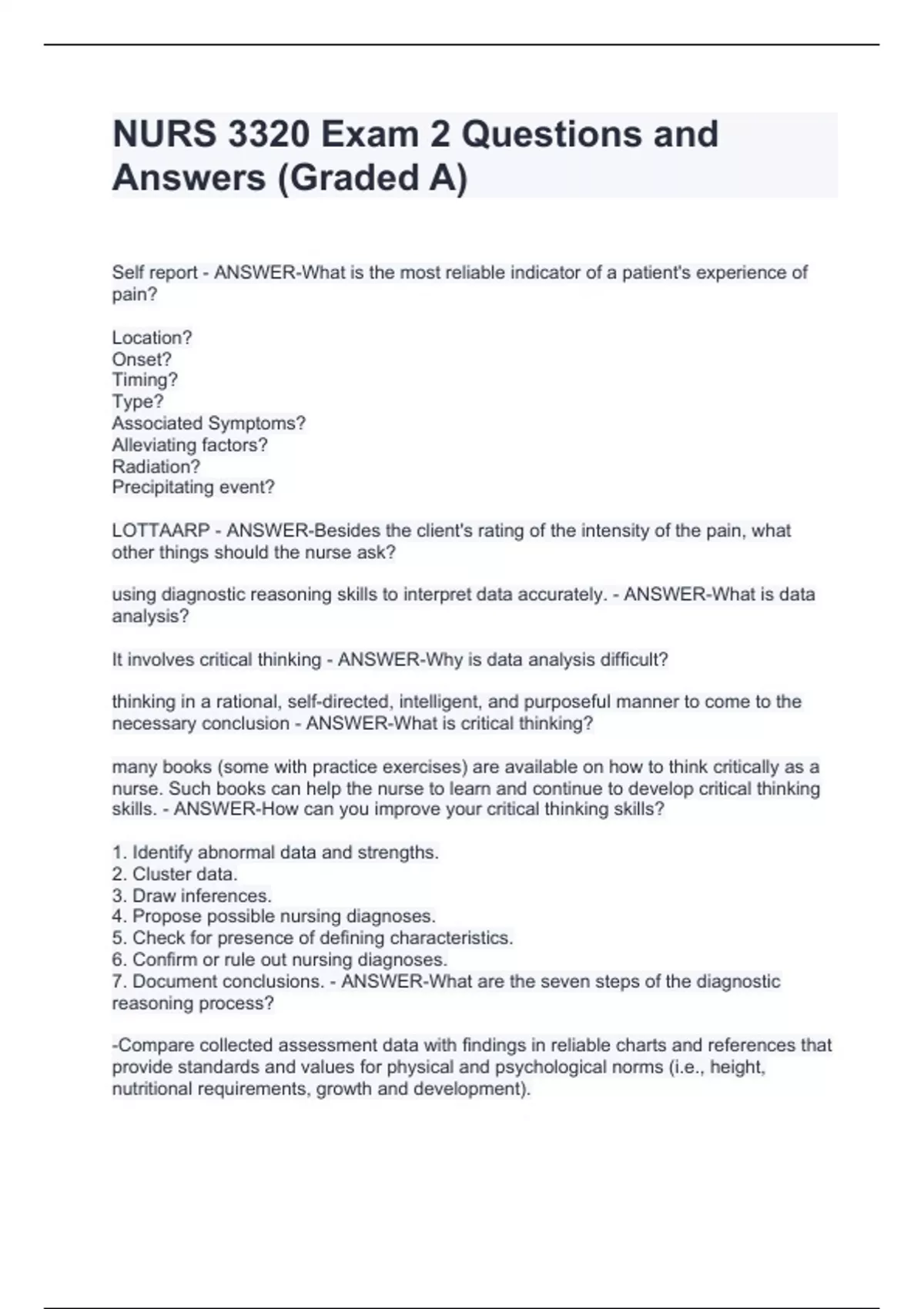 NURS 3320 Exam 2 Questions and Answers (Graded A)NURS 3320 Exam 2 Questions and Answers (Graded A)NURS 3320 Exam 2 Questions and Answers (Graded A)NURS 3320 Exam 2 Questions and Answers (Graded A) Self report - ANSWER-What is the most reliable indicator of a patient's experience of pain? Location? Onset? Timing? Type? Associated Symptoms? Alleviating factors? Radiation? Precipitating event? LOTTAARP - ANSWER-Besides the client's rating of the intensity of the pain, what other things should the nurse ask? using diagnostic reasoning skills to interpret data accurately. - ANSWER-What is data analysis?