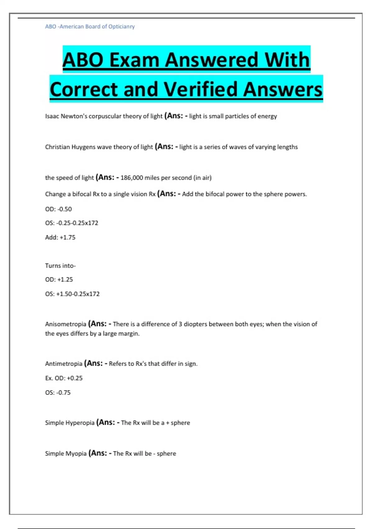 ABO Exam Answered With Correct and Verified Answers Isaac Newton's corpuscular theory of light (Ans: - light is small particles of energy Christian Huygens wave theory of light (Ans: - light is a series of waves of varying lengths the speed of light (Ans: - 186,000 miles per second (in air) Change a bifocal Rx to a single vision Rx (Ans: - Add the bifocal power to the sphere powers. OD: -0.50 OS: -0.25-0.25x172 Add: +1.75 Turns into- OD: +1.25 OS: +1.50-0.25x172