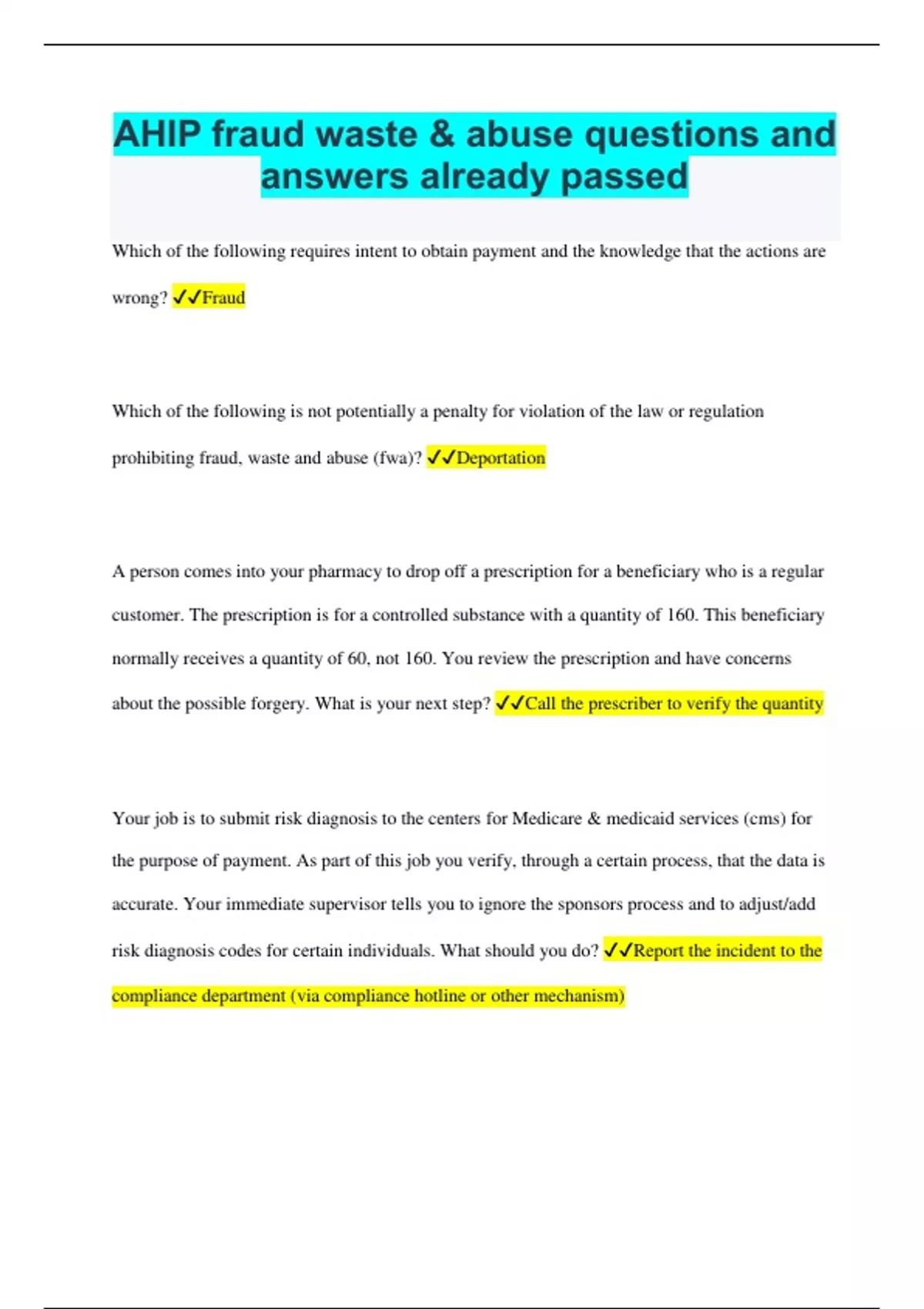 Which of the following requires intent to obtain payment and the knowledge that the actions are wrong? Fraud Which of the following is not potentially a penalty for violation of the law or regulation prohibiting fraud, waste and abuse (fwa)? Deportation A person comes into your pharmacy to drop off a prescription for a beneficiary who is a regular customer. The prescription is for a controlled substance with a quantity of 160. This beneficiary normally receives a quantity of 60, not 160. You review the prescription and have concerns about the possible forgery. What is your next step? Call the prescriber to verify the quantity Your job is to submit risk diagnosis to the centers for Medicare & medicaid services (cms) for the purpose of payment. As part of this job you verify, through a certain process, that the data is accurate. Your immediate supervisor tells you to ignore the sponsors process and to adjust/add risk diagnosis codes for certain individuals. What should you do? Report the incident to the compliance department (via compliance hotline or other mechanism)