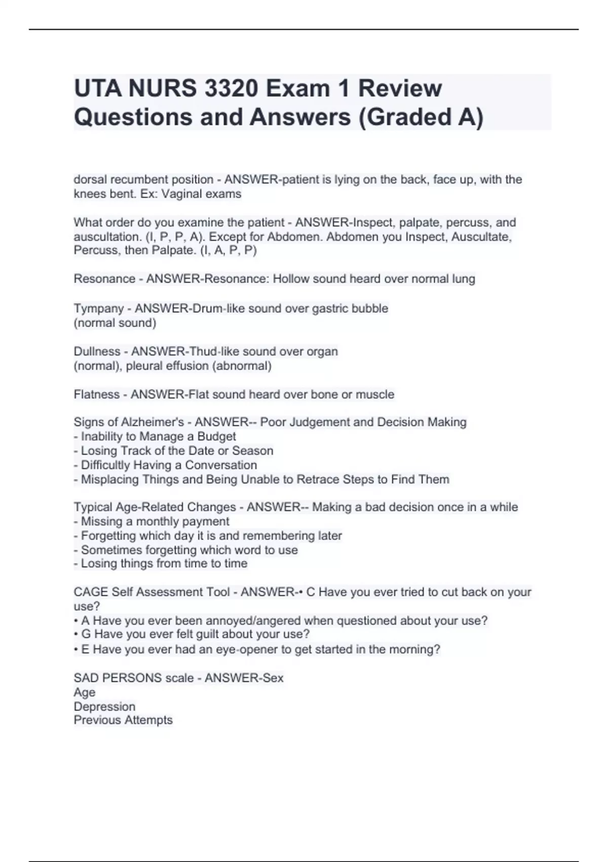 UTA NURS 3320 Exam 1 Review Questions and Answers (Graded A)UTA NURS 3320 Exam 1 Review Questions and Answers (Graded A)UTA NURS 3320 Exam 1 Review Questions and Answers (Graded A)UTA NURS 3320 Exam 1 Review Questions and Answers (Graded A) dorsal recumbent position - ANSWER-patient is lying on the back, face up, with the knees bent. Ex: Vaginal exams What order do you examine the patient - ANSWER-Inspect, palpate, percuss, and auscultation. (I, P, P, A). Except for Abdomen. Abdomen you Inspect, Auscultate, Percuss, then Palpate. (I, A, P, P) Resonance - ANSWER-Resonance: Hollow sound heard over normal lung