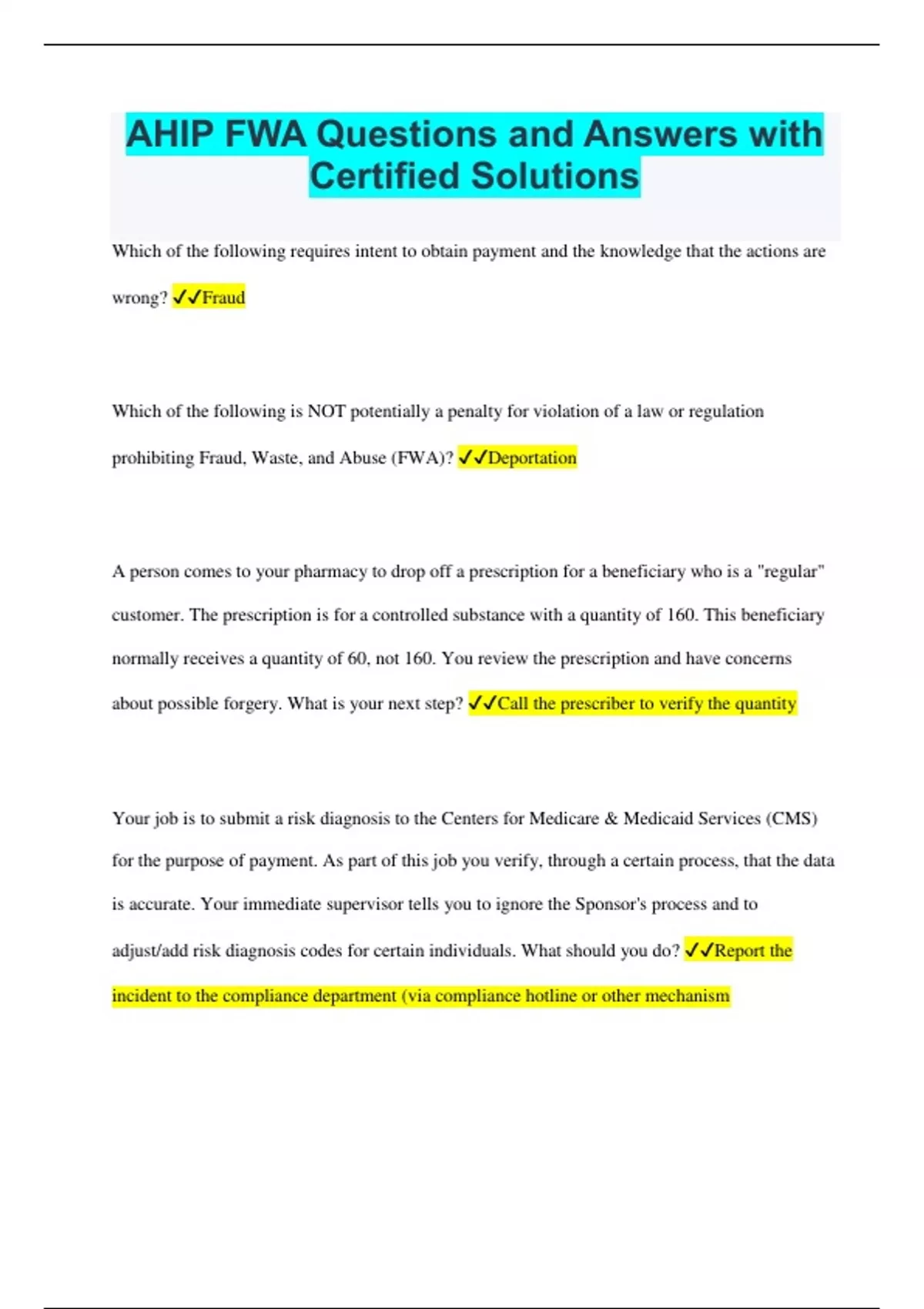 Which of the following requires intent to obtain payment and the knowledge that the actions are wrong? Fraud Which of the following is NOT potentially a penalty for violation of a law or regulation prohibiting Fraud, Waste, and Abuse (FWA)? Deportation A person comes to your pharmacy to drop off a prescription for a beneficiary who is a "regular" customer. The prescription is for a controlled substance with a quantity of 160. This beneficiary normally receives a quantity of 60, not 160. You review the prescription and have concerns about possible forgery. What is your next step? Call the prescriber to verify the quantity