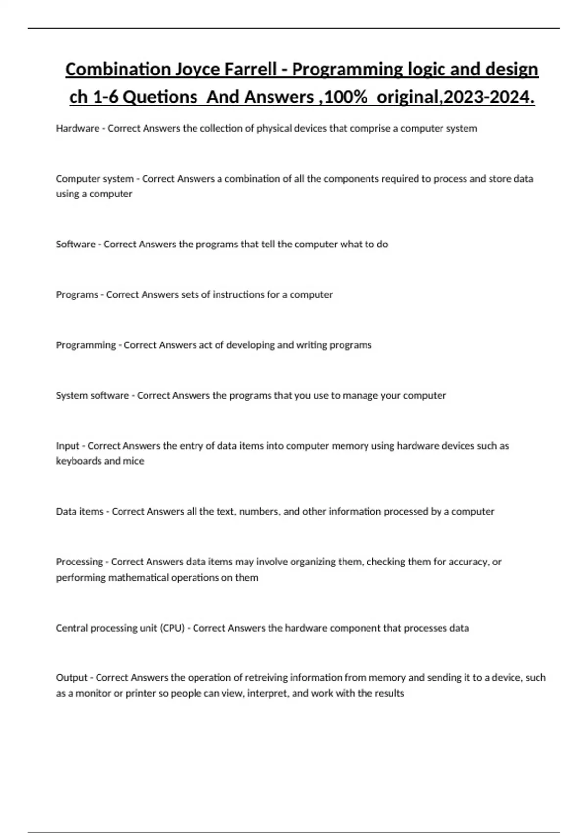 Combination Joyce Farrell - Programming logic and design ch 1-6 Quetions And Answers ,100% original,.