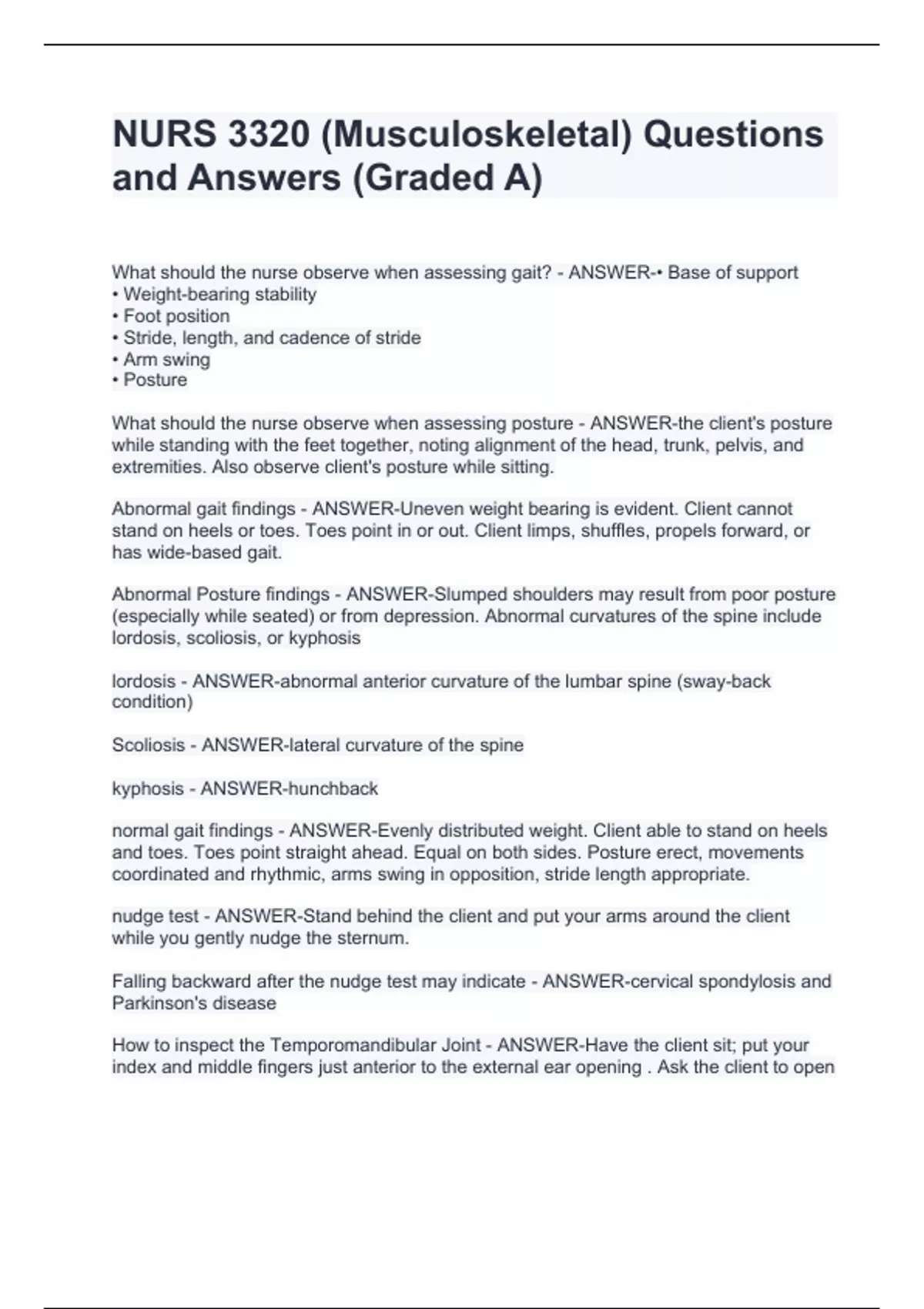 NURS 3320 (Musculoskeletal) Questions and Answers (Graded A)NURS 3320 (Musculoskeletal) Questions and Answers (Graded A)NURS 3320 (Musculoskeletal) Questions and Answers (Graded A)NURS 3320 (Musculoskeletal) Questions and Answers (Graded A)What should the nurse observe when assessing gait? - ANSWER-• Base of support • Weight-bearing stability • Foot position • Stride, length, and cadence of stride • Arm swing • Posture What should the nurse observe when assessing posture - ANSWER-the client's posture while standing with the feet together, noting alignment of the head, trunk, pelvis, and extremities. Also observe client's posture while sitting.