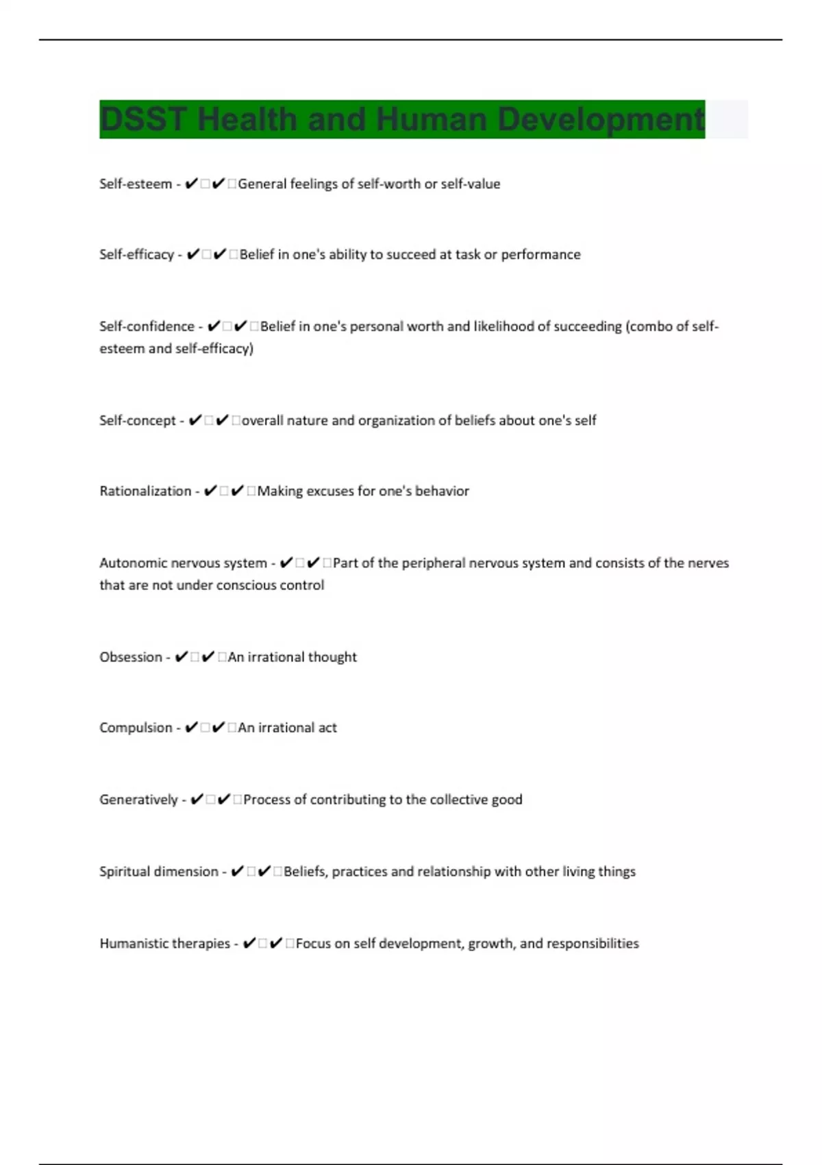 Self-esteem - ️️General feelings of self-worth or self-value Self-efficacy - ️️Belief in one's ability to succeed at task or performance Self-confidence - ️️Belief in one's personal worth and likelihood of succeeding (combo of self-esteem and self-efficacy) Self-concept - ️️overall nature and organization of beliefs about one's self Rationalization - ️️Making excuses for one's behavior Autonomic nervous system - ️️Part of the peripheral nervous system and consists of the nerves that are not under conscious control Obsession - ️️An irrational thought Compulsion - ️️An irrational act Generatively - ️️Process of contributing to the collective good Spiritual dimension - ️️Beliefs, practices and relationship with other living things Humanistic therapies - ️️Focus on self development, growth, and responsibilities