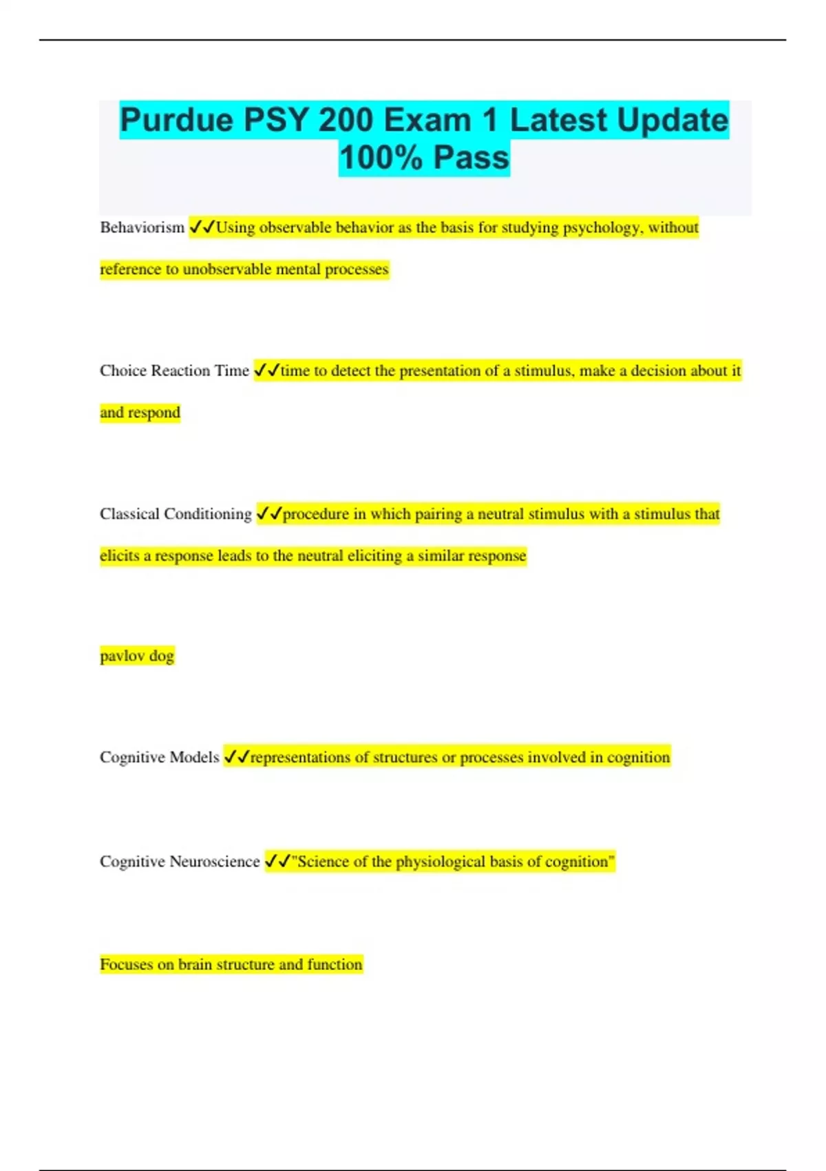 Purdue PSY 200 Exam 1 Latest Update 100% Pass Behaviorism Using observable behavior as the basis for studying psychology, without reference to unobservable mental processes Choice Reaction Time time to detect the presentation of a stimulus, make a decision about it and respond Classical Conditioning procedure in which pairing a neutral stimulus with a stimulus that elicits a response leads to the neutral eliciting a similar response pavlov dog Cognitive Models representations of structures or processes involved in cognition Cognitive Neuroscience "Science of the physiological basis of cognition" Focuses on brain structure and function Cognitive Psychology scientific study of the mind. systematic study of through observation and experimentation. Creates and controls mental functions Cognitive Science interdisiplinary work including psychology, computer science, linguistics, neuroscience, philosophy Comparative Psychology science of the minds of non-human animals Diffusion Model Information-processing view Introspection Trained participants describe their experiences and thoughts in response to stimuli Mental Chronometry inferring the timing of a cognitive process by measuring the time taken to raise your hand Operant conditioning procedure in which behavior is strengthened by presenting positive reinforcement or withdrawing negative reinforcement skinners rats Reaction/Response time Time between stimulus presentation and an observable response Simple reaction time time to detect the presentation of a stimulus and respond Structuralism our overall experience is just a combination of basic sensations Subtractive Method Action potential A brief electrical signal that travels down a neuron's axon and is involved in transmitting neural information Broca's aphasia Broca's area: region of frontal lobe involved with language Aphasia: difficulty using language to express thought ex: "book book two table" = Two books on table Cerebral cortex Outer layer of the brain that accomplishes higher mental functions Four lobes of Cerebral Cortex Frontal lobe Parietal lobe Occipital lobe Temporal lobe Cognitive neuroscience Electroencephalography (EEG) Electrodes placed around scalp to measure electrical activity emanating from neurons within brain. Record brainwaves. Event-related potentials (ERP's) EEG recordings time-locked to an event and averaged across many trails ADV: Very precise timing (>fMRI) DV: poor spatial resolution Functional magnetic resonance imaging (fMRI) generates images of brain activity by measuring changes in blood flow. Done via magnetic field and measuring disturbances ADV: imaging w/o surgery DV: Expensive Lesions cutting or removing brain tissue to examine behavior. Localization of function Some mental functions are achieved by specific brain areas. Near-infrared spectroscopy (NIRS) Shining light into skull and detecting how much is absorbed by brain. (brain activity leads to changes in blood flow that affect light absorption) ADV: Portable and inexpensive DV: Only activity in outer cortex can be examined Neuron A specialized cell that receives and transmits information in the nervous system Neuropsychology Study of behavioral effects from brain damage Neurotransmitters Chemicals released from vesicles in Neuron's axon Phrenology pseudoscience that assumed mental "propensities" are associated with specific brain areas and can be measured from skull surface Prosopagnosia an inability to recognize faces Single-cell recording of neurons Electrode inserted in brain tissue until tip is near neuron. Action potentials recorded while animal does task ADV: precise timing DV: Primary on animals who are different synapse gap between neurons Topographic organization Adjacent areas of the cortex process adjacent areas of the sensory field. Transcranial magnetic stimulation (TMS) Electric coil placed over part of brain area that sends currents to stimulate neurons temporarily activating or deactivating brain areas ADV: Enables cause and effect DV: Cannot stimulate deep in brain Wernicke's aphasia W's area: Temporal lobe involved in language comprehension aphasia: difficulty understanding language; production of meaningless speech. ex: "Mother is away here working her work out to get better.. but when she's looking, another time because she's getting too" Algorithms step-by-step procedures guaranteed to solve problems Bottom-up processing using sensory information from the environment Constructivism Perception involves actively constructing a percept based on sensory information from the environment and prior knowledge and expectations Direct perception perception is based solely on information from the environment Distal perception object in the environment Feature analysis Type of Bottom up processing breaking down stimulus into components and finding distinctive features to recognize stimulus Geon geometrical ions, 3 dimensional volume 36 different geons resistance to visual noise: gens can be perceived in "noisy" images Heuristics "rules of thumb" that provide best-guess solutions to problems Interactive activation model neural network model in which activation propagates through interconnected nodes Law of common fate things moving in the same direction appear to be group together Law of good continuation points belong together when they connect to form straight or smoothly curving lines Law of good figure stimulus pattern is seen such that the resulting structure is as simple as possible Law of proximity Things that are near to each other appear to be grouped together Law of similarity similar things appear to be grouped together Percept Meaningful interpretation of the proximal stimulus (e.g. stop sign) Perception Experience that results from sensation (stimulation of senses) Perceptual constancy Perceiving something to be unchanging in the environment despite changes in sensory input Principle of componential recovery object is recognized only if we can perceive its geons Prototype matchi