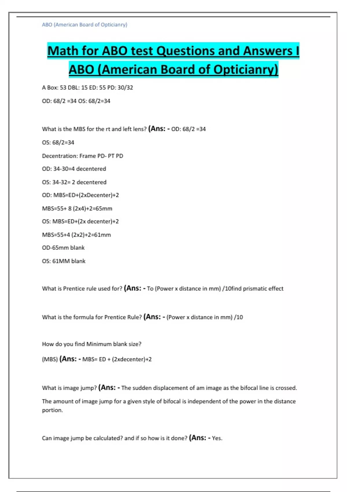 Math for ABO test Questions and Answers I ABO (American Board of Opticianry) A Box: 53 DBL: 15 ED: 55 PD: 30/32 OD: 68/2 =34 OS: 68/2=34 What is the MBS for the rt and left lens? (Ans: - OD: 68/2 =34 OS: 68/2=34 Decentration: Frame PD- PT PD OD: 34-30=4 decentered OS: 34-32= 2 decentered OD: MBS=ED+(2xDecenter)+2 MBS=55+ 8 (2x4)+2=65mm OS: MBS=ED+(2x decenter)+2 MBS=55+4 (2x2)+2=61mm OD-65mm blank OS: 61MM blank What is Prentice rule used for? (Ans: - To (Power x distance in mm) /10find prismatic effect What is the formula for Prentice Rule? (Ans: - (Power x distance in mm) /10 How do you find Minimum blank size? (MBS) (Ans: - MBS= ED + (2xdecenter)+2 What is image jump? (Ans: - The sudden displacement of am image as the bifocal line is crossed. The amount of image jump for a given style of bifocal is independent of the power in the distance portion. Can image jump be calculated? and if so how is it done? (Ans: - Yes. Use Prentice Rule.