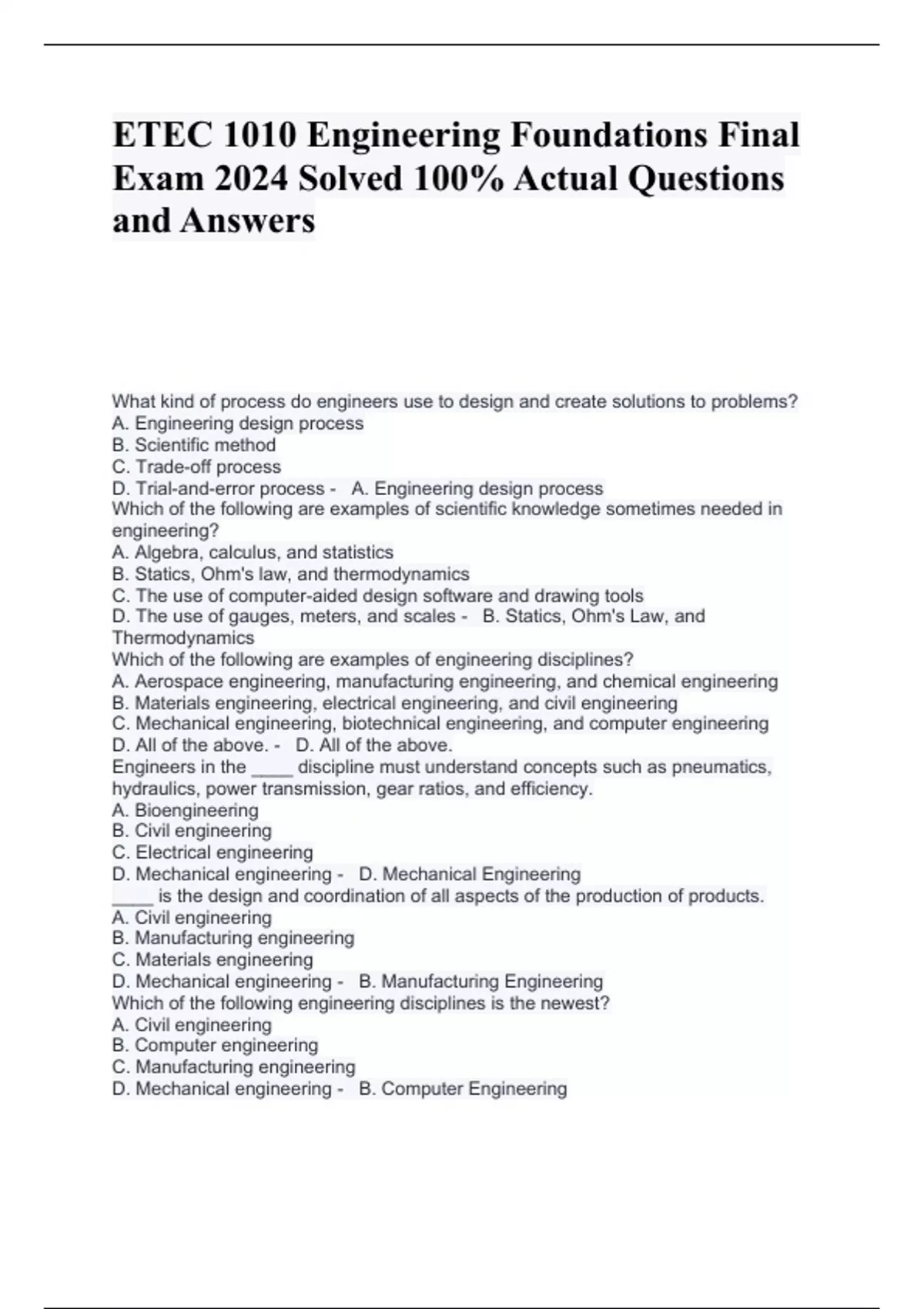 ETEC 1010 Engineering Foundations Final Exam 2024 Solved 100% Actual Questions and Answers What kind of process do engineers use to design and create solutions to problems? A. Engineering design process B. Scientific method C. Trade-off process D. Trial-and-error process - A. Engineering design process Which of the following are examples of scientific knowledge sometimes needed in engineering? A. Algebra, calculus, and statistics B. Statics, Ohm's law, and thermodynamics C. The use of computer-aided design software and drawing tools D. The use of gauges, meters, and scales - B. Statics, Ohm's Law, and Thermodynamics Which of the following are examples of engineering disciplines? A. Aerospace engineering, manufacturing engineering, and chemical engineering B. Materials engineering, electrical engineering, and civil engineering C. Mechanical engineering, biotechnical engineering, and computer engineering D. All of the above. - D. All of the above. Engineers in the ____ discipline must understand concepts such as pneumatics, hydraulics, power transmission, gear ratios, and efficiency. A. Bioengineering B. Civil engineering C. Electrical engineering D. Mechanical engineering - D. Mechanical Engineering ____ is the design and coordination of all aspects of the production of products. A. Civil engineering B. Manufacturing engineering C. Materials engineering D. Mechanical engineering - B. Manufacturing Engineering Which of the following engineering disciplines is the newest? A. Civil engineering B. Computer engineering C. Manufacturing engineering D. Mechanical engineering - B. Computer Engineering