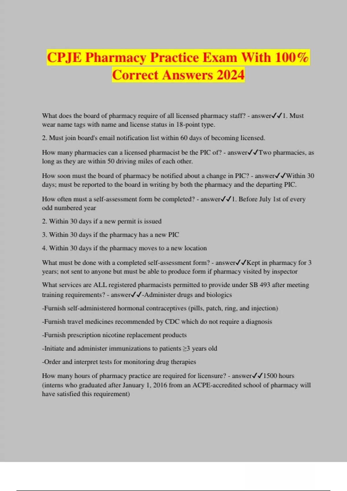 CPJE Pharmacy Practice Exam With 100% Correct Answers 2024 What does the board of pharmacy require of all licensed pharmacy staff? - answer1. Must wear name tags with name and license status in 18-point type. 2. Must join board's email notification list within 60 days of becoming licensed. How many pharmacies can a licensed pharmacist be the PIC of? - answerTwo pharmacies, as long as they are within 50 driving miles of each other. How soon must the board of pharmacy be notified about a change in PIC? - answerWithin 30 days; must be reported to the board in writing by both the pharmacy and the departing PIC. How often must a self-assessment form be completed? - answer1. Before July 1st of every odd numbered year 2. Within 30 days if a new permit is issued 3. Within 30 days if the pharmacy has a new PIC 4. Within 30 days if the pharmacy moves to a new location What must be done with a completed self-assessment form? - answerKept in pharmacy for 3 years; not sent to anyone but must be able to produce form if pharmacy visited by inspector What services are ALL registered pharmacists permitted to provide under SB 493 after meeting training requirements? - answer-Administer drugs and biologics -Furnish self-administered hormonal contraceptives (pills, patch, ring, and injection) -Furnish travel medicines recommended by CDC which do not require a diagnosis -Furnish prescription nicotine replacement products -Initiate and administer immunizations to patients ≥3 years old -Order and interpret tests for monitoring drug therapies How many hours of pharmacy practice are required for licensure? - answer1500 hours (interns who graduated after January 1, 2016 from an ACPE-accredited school of pharmacy will have satisfied this requirement) How often must a pharmacist license be renewed, and what are the CE requirements? - answer-Licenses must be renewed every 2 years (expires on the last day of the pharmacist's birth month) -30 hours of CE required with each renewal (with at least 2 hours of pharmacy law and ethics) -The first 2-year license cycle is exempt from CE -CE records must be kept on file for 4 years What services can Advanced Practice Pharmacists (APh) do under SB 493? - answer- Perform Patient Assessme