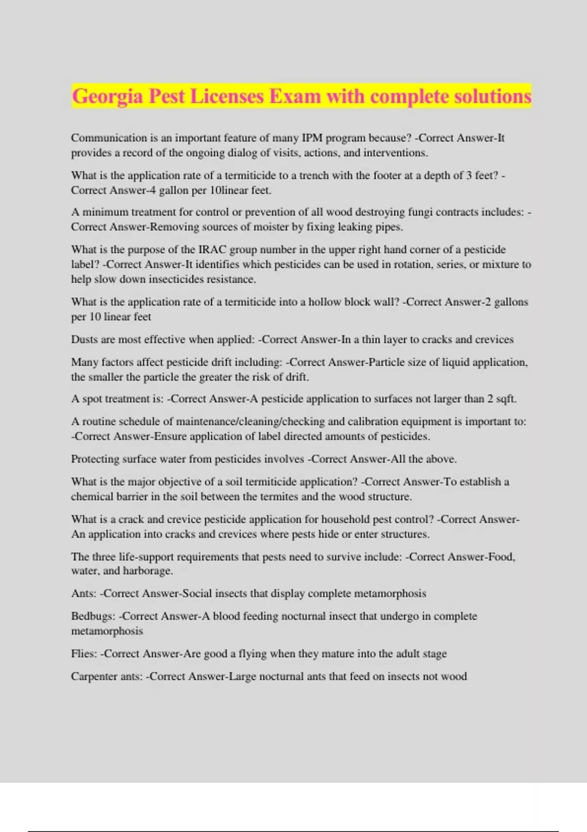 Georgia Pest Licenses Exam with complete solutions Communication is an important feature of many IPM program because? -Correct Answer-It provides a record of the ongoing dialog of visits, actions, and interventions. What is the application rate of a termiticide to a trench with the footer at a depth of 3 feet? - Correct Answer-4 gallon per 10linear feet. A minimum treatment for control or prevention of all wood destroying fungi contracts includes: - Correct Answer-Removing sources of moister by fixing leaking pipes. What is the purpose of the IRAC group number in the upper right hand corner of a pesticide label? -Correct Answer-It identifies which pesticides can be used in rotation, series, or mixture to help slow down insecticides resistance. What is the application rate of a termiticide into a hollow block wall? -Correct Answer-2 gallons per 10 linear feet Dusts are most effective when applied: -Correct Answer-In a thin layer to cracks and crevices Many factors affect pesticide drift including: -Correct Answer-Particle size of liquid application, the smaller the particle the greater the risk of drift. A spot treatment is: -Correct Answer-A pesticide application to surfaces not larger than 2 sqft. A routine schedule of maintenance/cleaning/checking and calibration equipment is important to: -Correct Answer-Ensure application of label directed amounts of pesticides. Protecting surface water from pesticides involves -Correct Answer-All the above. What is the major objective of a soil termiticide application? -Correct Answer-To establish a chemical barrier in the soil between the termites and the wood structure. What is a crack and crevice pesticide application for household pest control? -Correct Answer- An application into cracks and crevices where pests hide or enter structures. The three life-support requirements that pests need to survive include: -Correct Answer-Food, water, and harborage. Ants: -Correct Answer-Social insects that display complete metamorphosis Bedbugs: -Correct Answer-A blood feeding nocturnal insect that undergo in complete metamorphosis Flies: -Correct Answer-Are good a flying when they mature into the adult stage Carpenter ants: -Correct Answer-Large nocturnal ants that feed on insects not wood