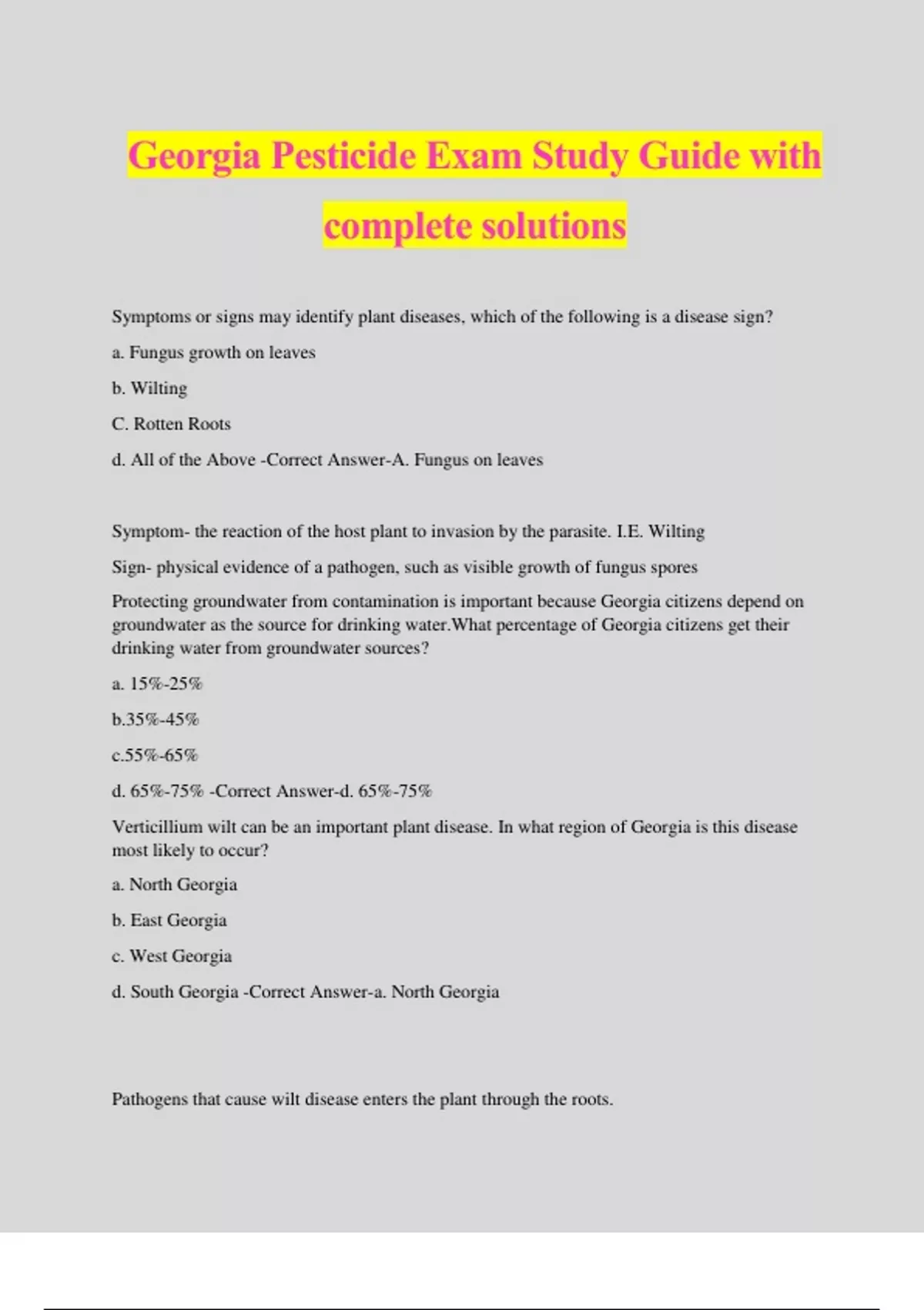 Georgia Pesticide Exam Study Guide with complete solutions Symptoms or signs may identify plant diseases, which of the following is a disease sign? a. Fungus growth on leaves b. Wilting C. Rotten Roots d. All of the Above -Correct Answer-A. Fungus on leaves Symptom- the reaction of the host plant to invasion by the parasite. I.E. Wilting Sign- physical evidence of a pathogen, such as visible growth of fungus spores Protecting groundwater from contamination is important because Georgia citizens depend on groundwater as the source for drinking water.What percentage of Georgia citizens get their drinking water from groundwater sources? a. 15%-25% b.35%-45% c.55%-65% d. 65%-75% -Correct Answer-d. 65%-75% Verticillium wilt can be an important plant disease. In what region of Georgia is this disease most likely to occur? a. North Georgia b. East Georgia c. West Georgia d. South Georgia -Correct Answer-a. North Georgia Pathogens that cause wilt disease enters the plant through the roots. Verticillium Wilt- Fungus; normally occurs in cooler areas with lower soil temperatures, When does groundwater form? a. When water moves below the earth's surface to fill empty spaces in and around rocks and porous materials like sand. b. When water collects into lakes, ponds, and streams on the surface of the ground c. When more water is pumped from the ground than is replenished by rain d. When man's activities deform and rebuild the earth's surface -Correct Answer-A. A plant has the following symptoms. Yellow bands form around the leaf veins, and the plant is stunted. What is the most likely cause for this disease? a) Nematode b) virus c) fungus d) bacterium -Correct Answer-B. Why should we protect endangered species? a. many medicines are derived from plants b. genetic material of wild species is used to revitalize domestic species c. if a species becomes extinct, it can never be