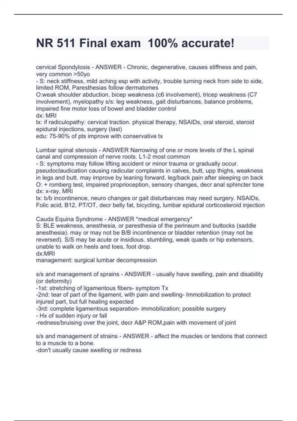 NR 511 Final exam 100% accurate! cervical Spondylosis - ANSWER - Chronic, degenerative, causes stiffness and pain, very common 50yo - S: neck stiffness, mild aching esp with activity, trouble turning neck from side to side, limited ROM, Paresthesias follow dermatomes O:weak shoulder abduction, bicep weakness (c6 involvement), tricep weakness (C7 involvement), myelopathy s/s: leg weakness, gait disturbances, balance problems, impaired fine motor loss of bowel and bladder control dx: MRI tx: if radiculopathy: cervical traction. physical therapy, NSAIDs, oral steroid, steroid epidural injections, surgery (last) edu: 75-90% of pts improve with conservative tx Lumbar spinal stenosis - ANSWER Narrowing of one or more levels of the L spinal canal and compression of nerve roots. L1-2 most common - S: symptoms may follow lifting accident or minor trauma or gradually occur. pseudoclaudication causing radicular complaints in calves, butt, upp thighs, weakness in legs and butt. may improve by leaning forward. leg/back pain after sleeping on back O: + romberg test, impaired proprioception, sensory changes, decr anal sphincter tone dx: x-ray, MRi tx: b/b incontinence, neuro changes or gait disturbances may need surgery. NSAIDs, Folic acid, B12, PT/OT, decr belly fat, bicycling, lumbar epidural corticosteroid injection Cauda Equina Syndrome - ANSWER *medical emergency* S: BLE weakness, anesthesia, or paresthesia of the perineum and buttocks (saddle anesthesia). may or may not be B/B incontinence or bladder retention (may not be reversed). S/S may be acute or insidious. stumbling, weak quads or hip extensors, unable to walk on heels and toes, foot drop. dx:MRI management: surgical lumbar decompression s/s and management of sprains - ANSWER - usually have swelling, pain and disability (or deformity) -1st: stretching of ligamentous fibers- symptom Tx -2nd: tear of part of the ligament, with pain and swelling- Immobilization to protect injured part, but full healing expected -3rd: complete ligamentous separation- immobilization; possible surgery - Hx of sudden injury or fall -redness/bruising over the joint, decr A&P ROM,pain with movement of joint s/s and management of strains - ANSWER - affect the muscles or tendons that connect to a muscle to a bone.