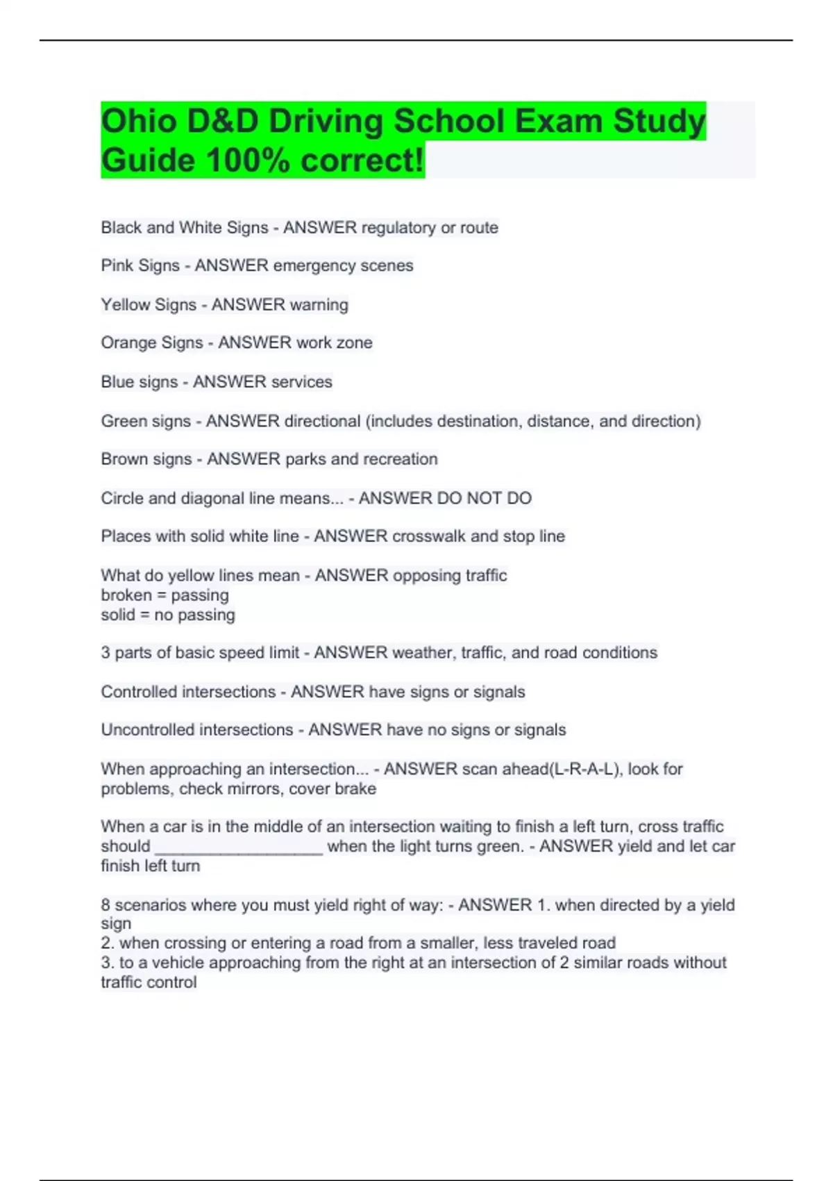 Ohio D&D Driving School Exam SBlack and White Signs - ANSWER regulatory or route Pink Signs - ANSWER emergency scenes Yellow Signs - ANSWER warning Orange Signs - ANSWER work zone Blue signs - ANSWER services Green signs - ANSWER directional (includes destination, distance, and direction) Brown signs - ANSWER parks and recreation Circle and diagonal line means... - ANSWER DO NOT DO Places with solid white line - ANSWER crosswalk and stop line What do yellow lines mean - ANSWER opposing traffic broken = passing solid = no passing 3 parts of basic speed limit - ANSWER weather, traffic, and road conditions Controlled intersections - ANSWER have signs or signals Uncontrolled intersections - ANSWER have no signs or signals When approaching an intersection... - ANSWER scan ahead(L-R-A-L), look for problems, check mirrors, cover brake When a car is in the middle of an intersection waiting to finish a left turn, cross traffic should __________________ when the light turns green. - ANSWER yield and let car finish left turn 8 scenarios where you must yield right of way: - ANSWER 1. when directed by a yield sign 2. when crossing or entering a road from a smaller, less traveled road 3. to a vehicle approaching from the right at an intersection of 2 similar roads without traffic control 4. to a pedestrian in crosswalk 5. to emergency vehicles 6. to funeral procession 7. to oncoming traffic when making left turn 8. to traffic and pedestrians when making a right on red True or False You don't have to stop at a downed stop sign. - ANSWER False. It's still a stop sign. tudy Guide 100% correct!