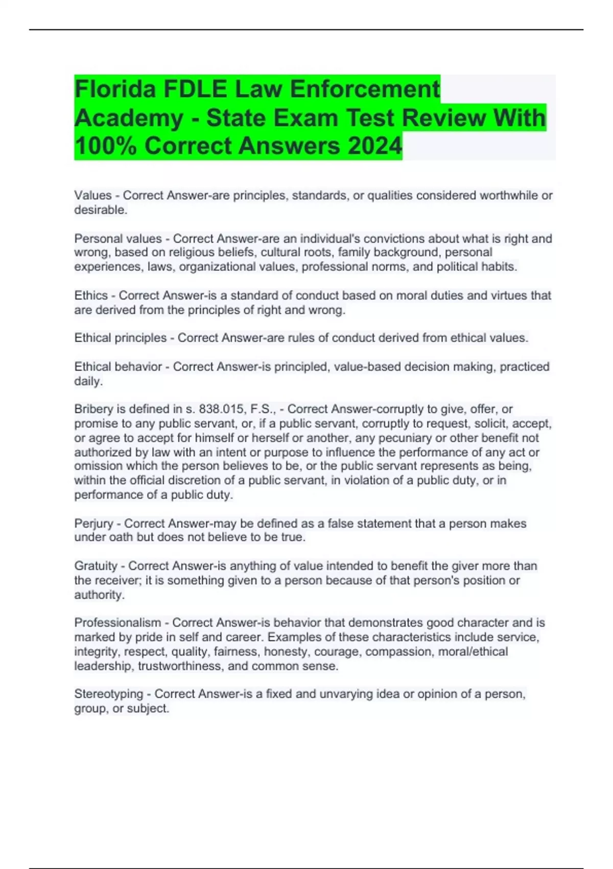 Florida FDLE Law Enforcement Academy - State Exam Test Review With 100% Correct Answers 2024