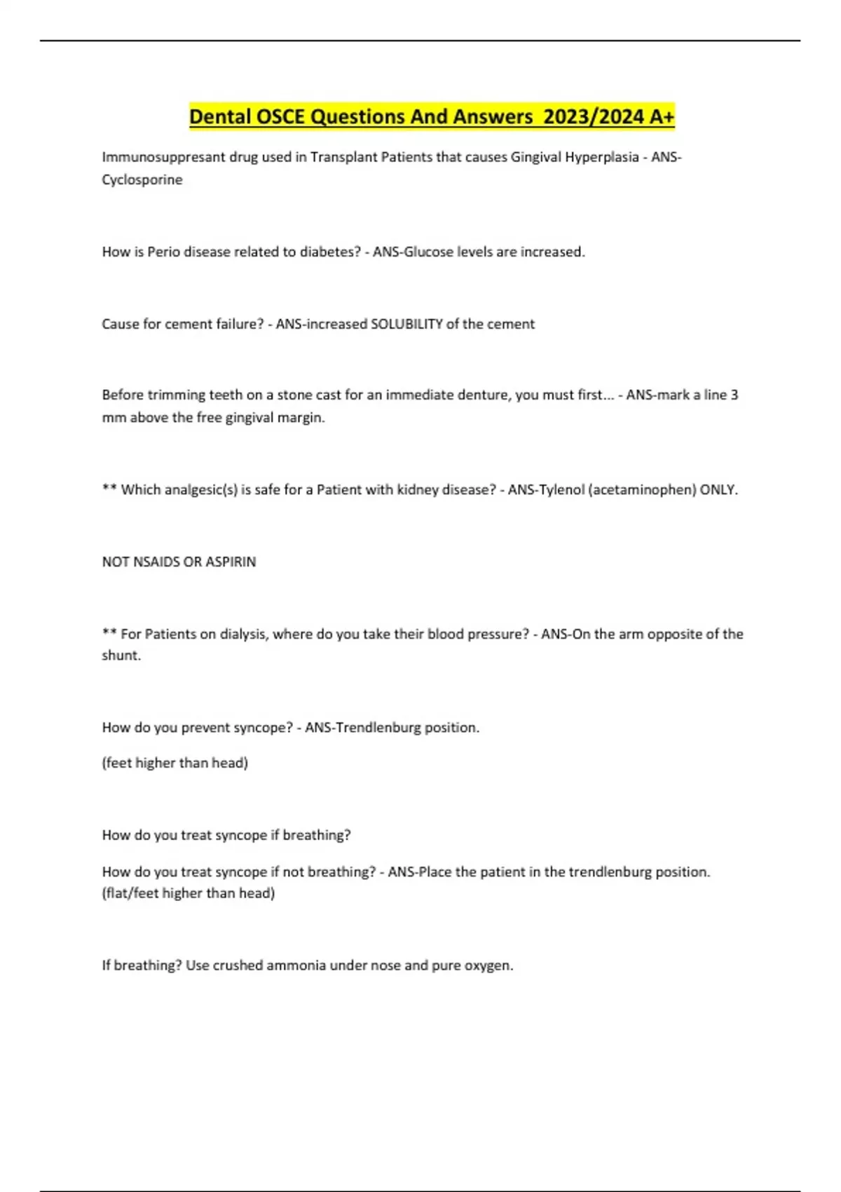 Dental OSCE Questions And Answers 2023/2024 A+ Immunosuppresant drug used in Transplant Patients that causes Gingival Hyperplasia - ANSCyclosporine How is Perio disease related to diabetes? - ANS-Glucose levels are increased. Cause for cement failure? - ANS-increased SOLUBILITY of the cement Before trimming teeth on a stone cast for an immediate denture, you must first... - ANS-mark a line 3 mm above the free gingival margin. ** Which analgesic(s) is safe for a Patient with kidney disease? - ANS-Tylenol (acetaminophen) ONLY. NOT NSAIDS OR ASPIRIN ** For Patients on dialysis, where do you take their blood pressure? - ANS-On the arm opposite of the shunt. How do you prevent syncope? - ANS-Trendlenburg position. (feet higher than head) How do you treat syncope if breathing? How do you treat syncope if not breathing? - ANS-Place the patient in the trendlenburg position. (flat/feet higher than head) If breathing? Use crushed ammonia under nose and pure oxygen. Not breathing? start BLS. Treatment of a child with Fibrous Dysplasia? - ANS-for kids, prolong surgical intervention as long as possible. some lesions will stabilize & some lesions will grown. Only surgically remove if esthetics are a concern. *Note: Fibrous dysplasia is an uncommon bone disorder in which scar-like (fibrous) tissue develops in place of normal bone. This can weaken the affected bone & cause deformations or fractures. *Radiographic appearance: orange peel if late stage. ** Treatment of barbiturate allergic reaction. - ANS-antihistamine (synergic reaction to barbituate) ** look at this. **Can you treat a patient who had Hepatitis A, one year ago? - ANS-yes. they can be treated "1 week after having jaundice" -- the exam referred to it as jaundice. At what intervals are intermediate dentures evaluated? - ANS-24- hrs. 72- hrs. 1 week 1 month Every 3 months **How long to keep a dressing on after periodontal treatment? - ANS-Pack is kept in for 1 week after surgery. TX for Primary herpetic gingivostomatitis? - ANS-Palliative only - you only treat for fever and pain. Eagles Syndrome symptoms - ANS-Pain while swallowing, turning head, or mouth opening. may include dysphagia, dysphonia, otalgia, headaches, dizziness. * The elongation of styloid process// mineralization of the stylohyoid ligament. ** Epinepherine//vasoconstrictors are contraindicated in patients with ____________. They would exacerbate the symptoms. - ANS-hyperthyroid - My exam asked which anesthetic to use on someone with hyperthyroid patients. ** ** "Opalescent hue" - ANS-dentinogenesis imperfecta -- my exam showed a pic of eyes (blue sclera) and stated this patient had brittle bones. this exam intertwines osteogenesis imperfecta with DI, I think. OI was not an option. Radiographic findings of Dentinogenesis Imperfecta. - ANS-Bulbous crowns. Obliterated canals & Pulp chambers. Cervical Constrictions amelogenesis imperfecta heredity - ANS-dominant/recessive/x-linked. ** hypomaturation amelogenesis imperfecta manifests clinically as.... showed an image but it wasn't quite textbook - ANS-"Sn