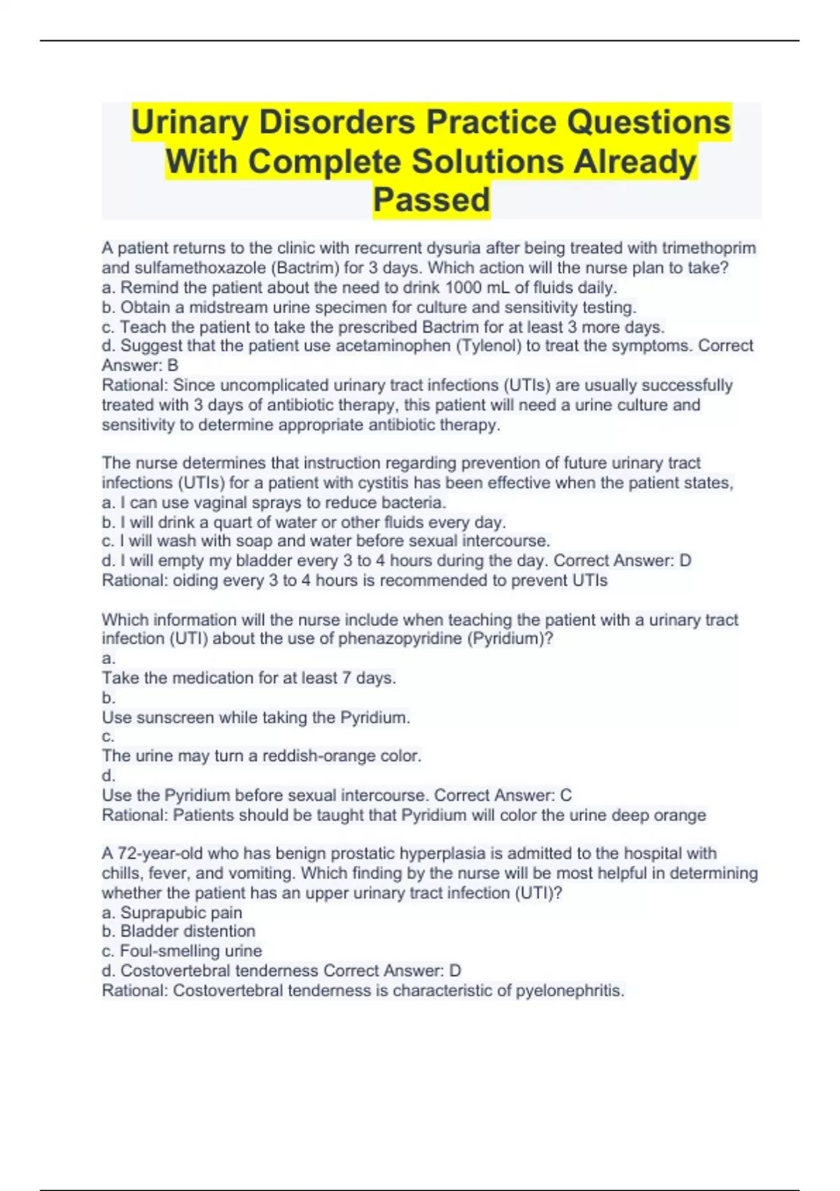 Urinary Disorders Practice Questions With Complete Solutions Already Passed