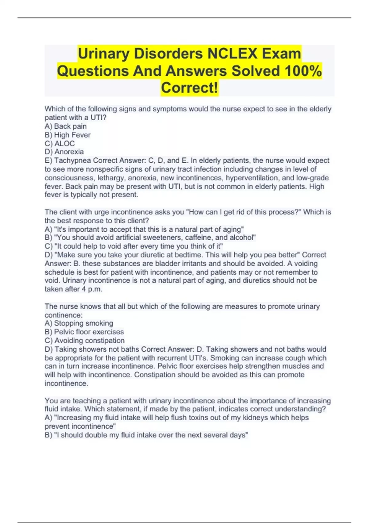 Urinary Disorders NCLEX Exam Questions And Answers Solved