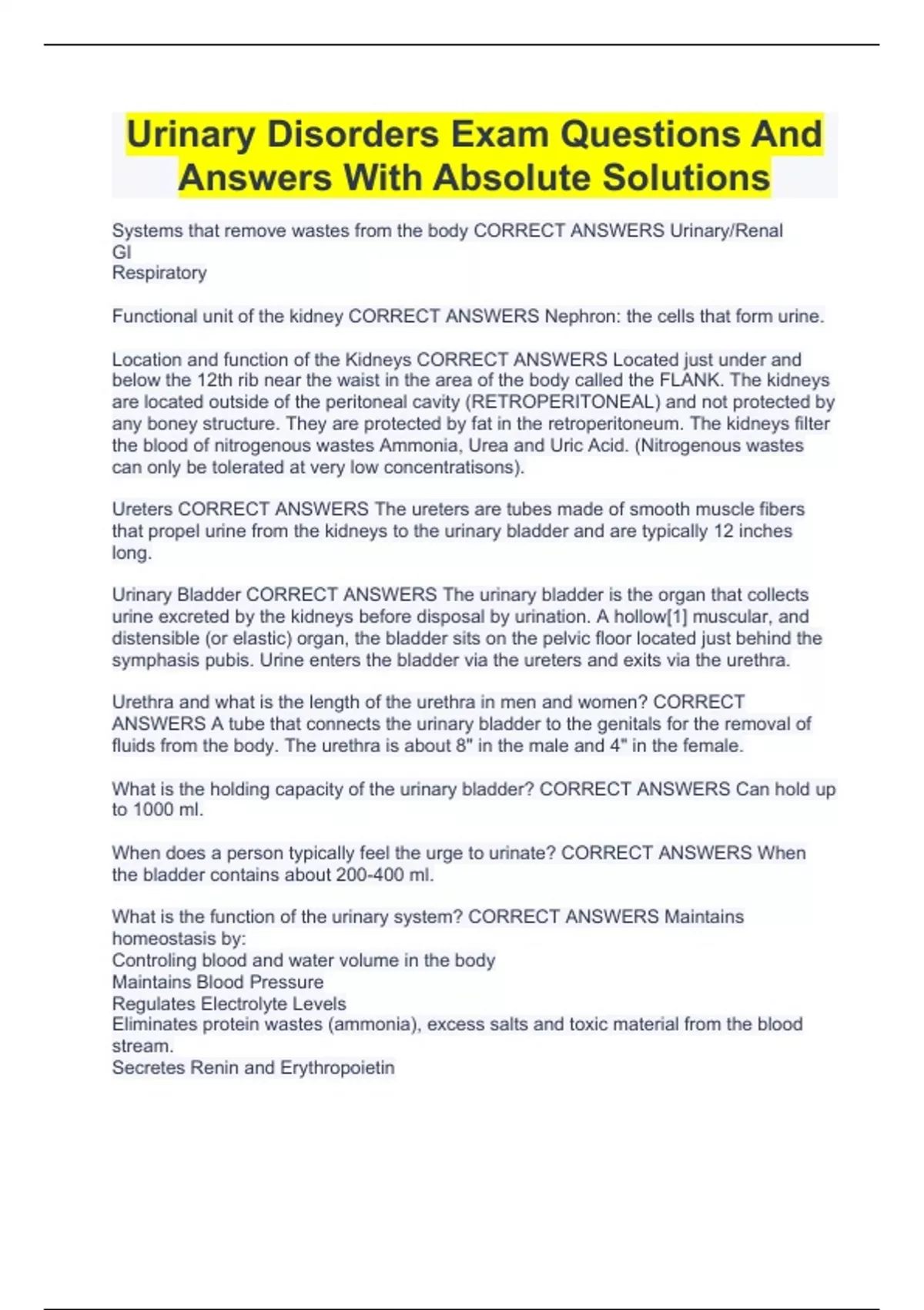 Urinary Disorders Exam Questions And Answers With Absolute Solutions