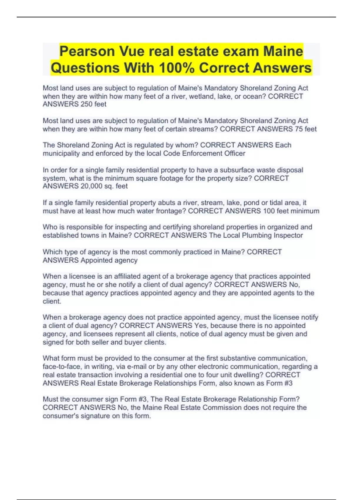 Pearson Vue real estate exam Maine Questions