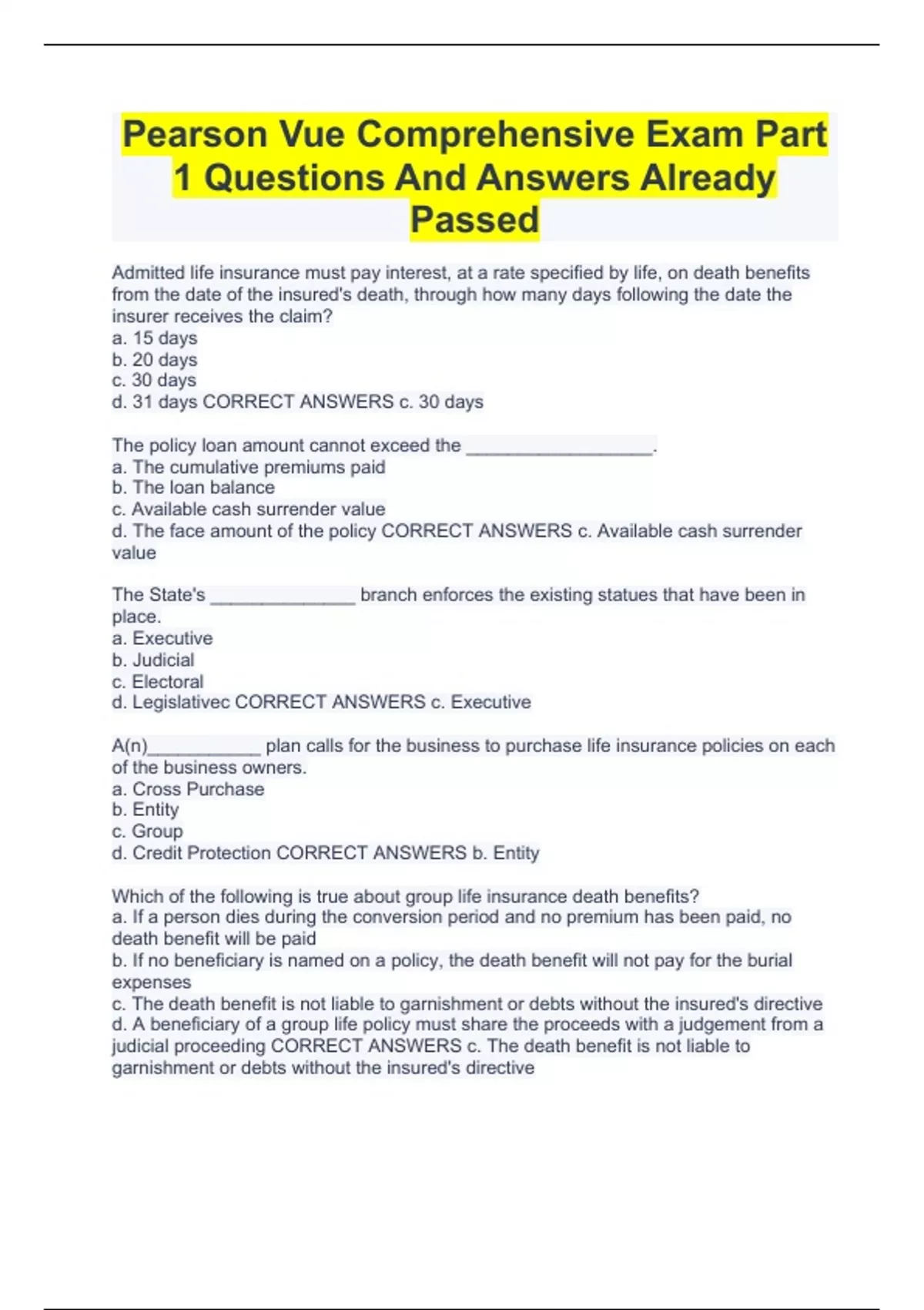 Pearson Vue Comprehensive Exam Part 1 Questions And Answers Already Passed