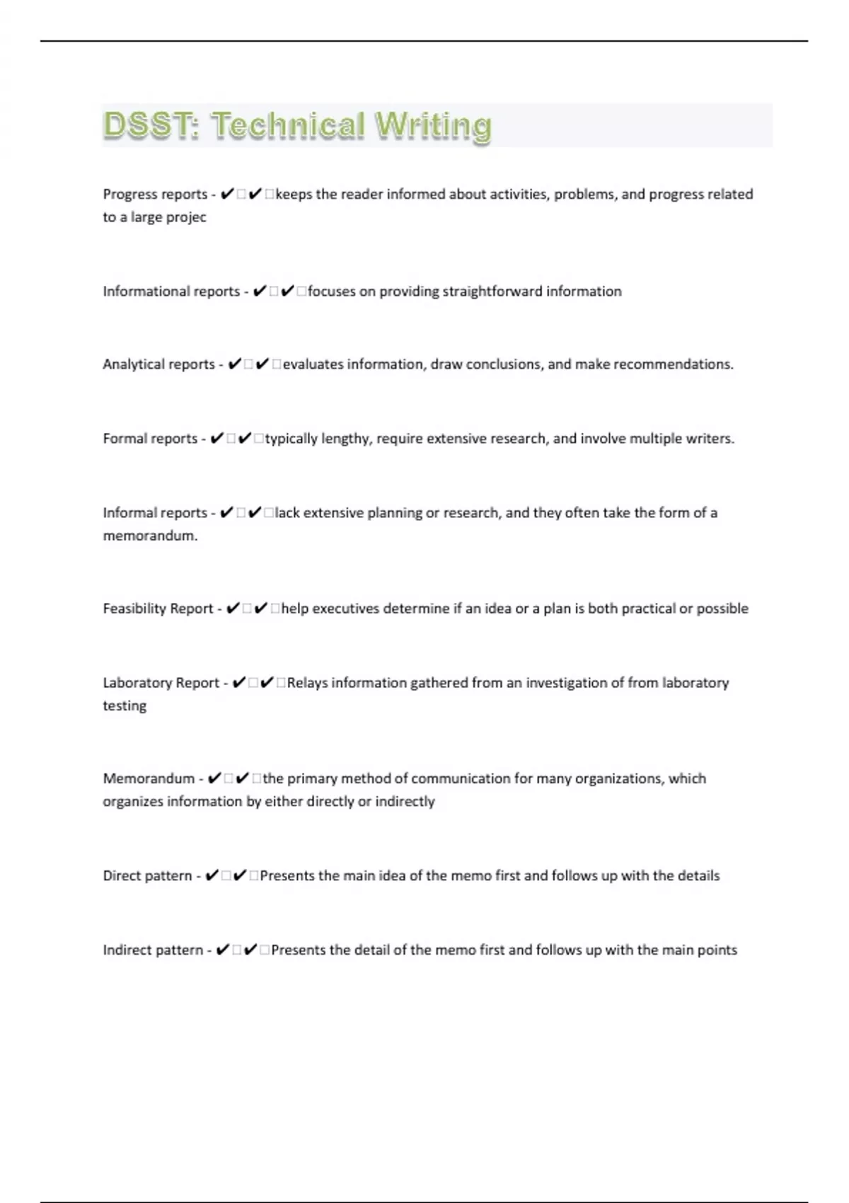 Progress reports - ️️keeps the reader informed about activities, problems, and progress related to a large projec Informational reports - ️️focuses on providing straightforward information Analytical reports - ️️evaluates information, draw conclusions, and make recommendations. Formal reports - ️️typically lengthy, require extensive research, and involve multiple writers. Informal reports - ️️lack extensive planning or research, and they often take the form of a memorandum. Feasibility Report - ️️help executives determine if an idea or a plan is both practical or possible Laboratory Report - ️️Relays information gathered from an investigation of from laboratory testing Memorandum - ️️the primary method of communication for many organizations, which organizes information by either directly or indirectly Direct pattern - ️️Presents the main idea of the memo first and follows up with the details Indirect pattern - ️️Presents the detail of the memo first and follows up with the main points