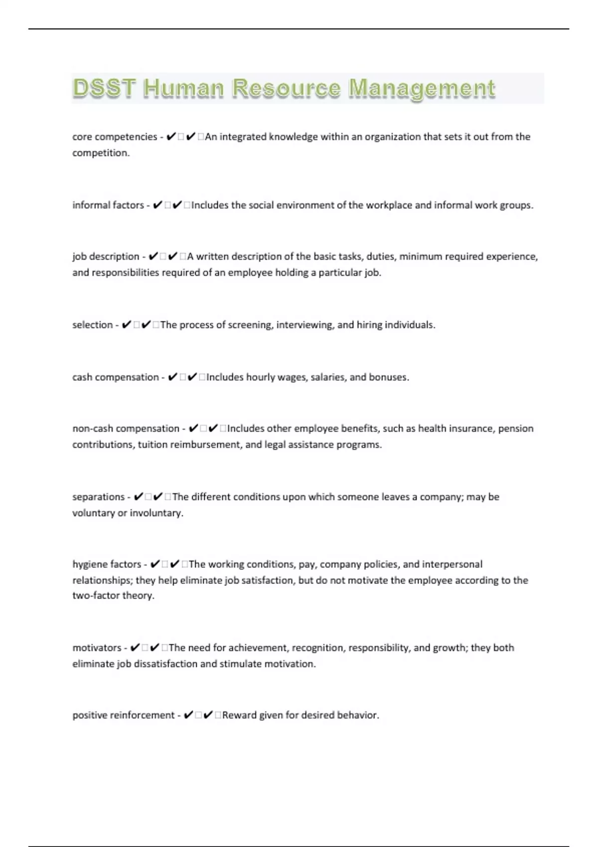 core competencies - ️️An integrated knowledge within an organization that sets it out from the competition. informal factors - ️️Includes the social environment of the workplace and informal work groups. job description - ️️A written description of the basic tasks, duties, minimum required experience, and responsibilities required of an employee holding a particular job. selection - ️️The process of screening, interviewing, and hiring individuals. cash compensation - ️️Includes hourly wages, salaries, and bonuses. non-cash compensation - ️️Includes other employee benefits, such as health insurance, pension contributions, tuition reimbursement, and legal assistance programs. separations - ️️The different conditions upon which someone leaves a company; may be voluntary or involuntary. hygiene factors - ️️The working conditions, pay, company policies, and interpersonal relationships; they help eliminate job satisfaction, but do not motivate the employee according to the two-factor theory. motivators - ️️The need for achievement, recognition, responsibility, and growth; they both eliminate job dissatisfaction and stimulate motivation. positive reinforcement - ️️Reward given for desired behavior.
