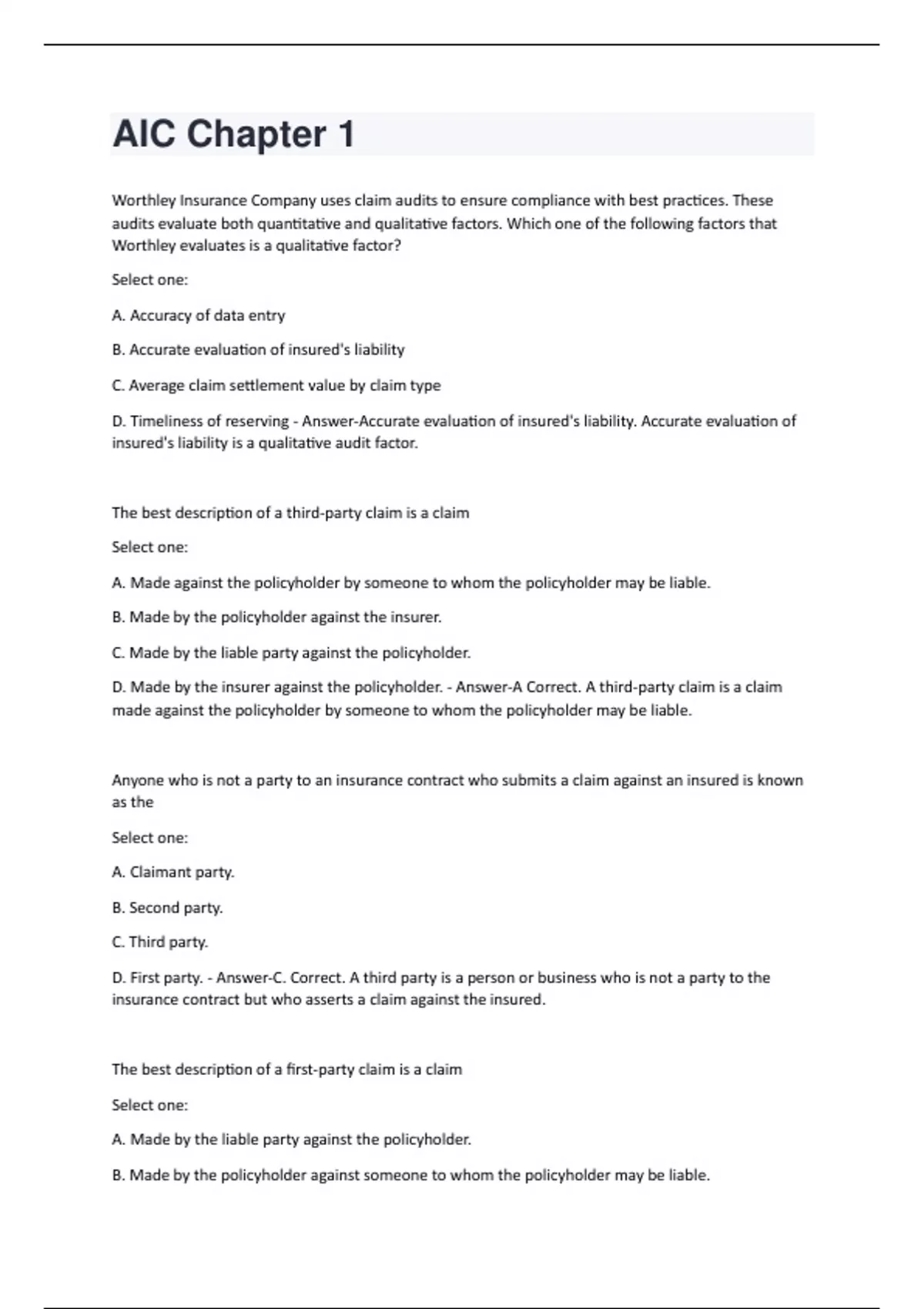 Worthley Insurance Company uses claim audits to ensure compliance with best practices. These audits evaluate both quantitative and qualitative factors. Which one of the following factors that Worthley evaluates is a qualitative factor? Select one: A. Accuracy of data entry B. Accurate evaluation of insured's liability C. Average claim settlement value by claim type D. Timeliness of reserving - Answer-Accurate evaluation of insured's liability. Accurate evaluation of insured's liability is a qualitative audit factor. The best description of a third-party claim is a claim Select one: A. Made against the policyholder by someone to whom the policyholder may be liable. B. Made by the policyholder against the insurer. C. Made by the liable party against the policyholder. D. Made by the insurer against the policyholder. - Answer-A Correct. A third-party claim is a claim made against the policyholder by someone to whom the policyholder may be liable. Anyone who is not a party to an insurance contract who submits a claim against an insured is known as the Select one: A. Claimant party. B. Second party. C. Third party. D. First party. - Answer-C. Correct. A third party is a person or business who is not a party to the insurance contract but who asserts a claim against the insured. The best description of a first-party claim is a claim Select one: A. Made by the liable party against the policyholder. B. Made by the policyholder against someone to whom the policyholder may be liable.C. Made by the insurer against the policyholder. D. Made by the policyholder against the insurer. - Answer-D. Correct. The best description of a firstparty claim is a claim made by the policyholder against the insurer. In an insurance transaction, the insured is designated the Select one: A. First party. B. Second party. C. Third party. D. Fourth party. - Answer-A. First party Correct. In an insurance transaction, the insured is designated the first party.