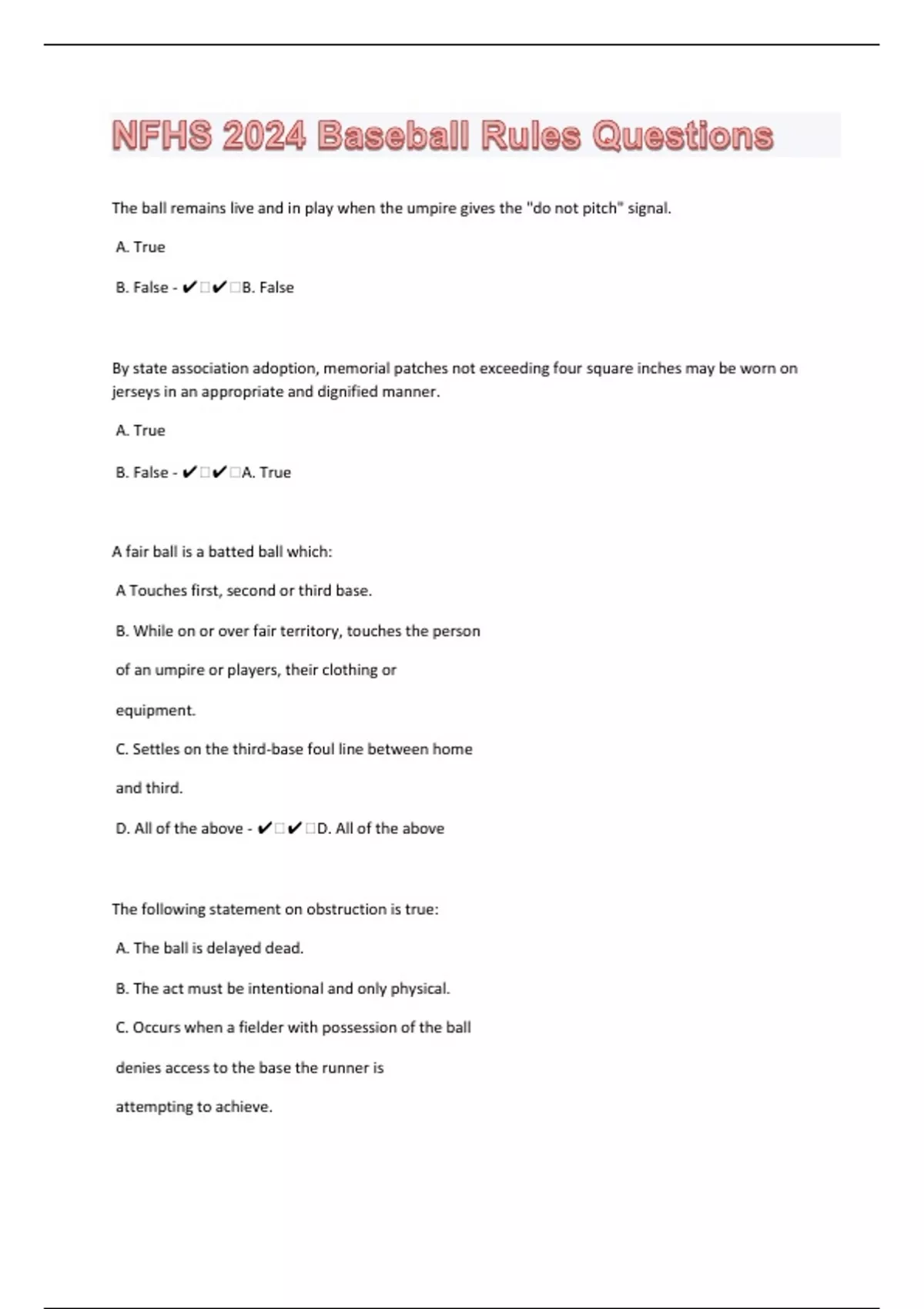 NFHS 2024 Baseball Rules |92 Questions With 100% Correct Answers|31 Pages