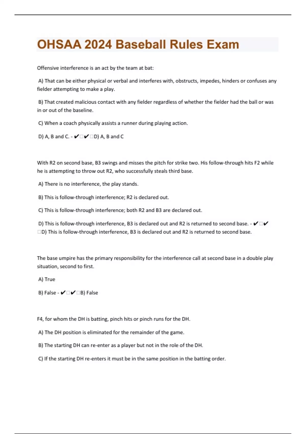 Offensive interference is an act by the team at bat: A) That can be either physical or verbal and interferes with, obstructs, impedes, hinders or confuses any fielder attempting to make a play. B) That created malicious contact with any fielder regardless of whether the fielder had the ball or was in or out of the baseline. C) When a coach physically assists a runner during playing action. D) A, B and C. - ️️D) A, B and C With R2 on second base, B3 swings and misses the pitch for strike two. His follow-through hits F2 while he is attempting to throw out R2, who successfully steals third base. A) There is no interference, the play stands. B) This is follow-through interference; R2 is declared out. C) This is follow-through interference; both R2 and B3 are declared out. D) This is follow-through interference, B3 is declared out and R2 is returned to second base. - ️️D) This is follow-through interference, B3 is declared out and R2 is returned to second base. The base umpire has the primary responsibility for the interference call at second base in a double play situation, second to first. A) True B) False - ️️B) False F4, for whom the DH is batting, pinch hits or pinch runs for the DH. A) The DH position is eliminated for the remainder of the game. B) The starting DH can re-enter as a player but not in the role of the DH. C) If the starting DH re-enters it must be in the same position in the batting order. D) All the above - ️️D) All the above