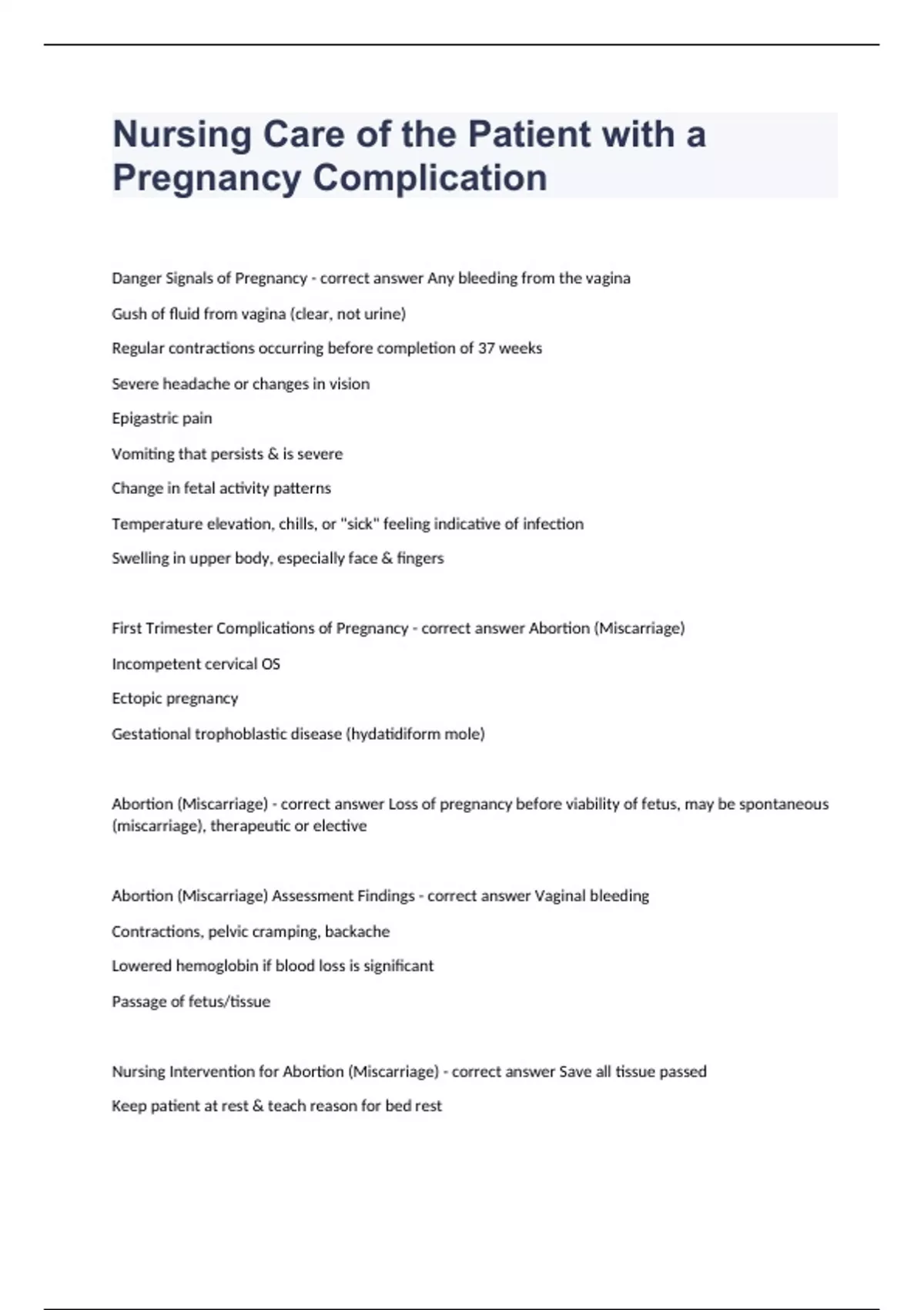 Nursing Care of the Patient with a Pregnancy Complication questions and answers already solved 2024