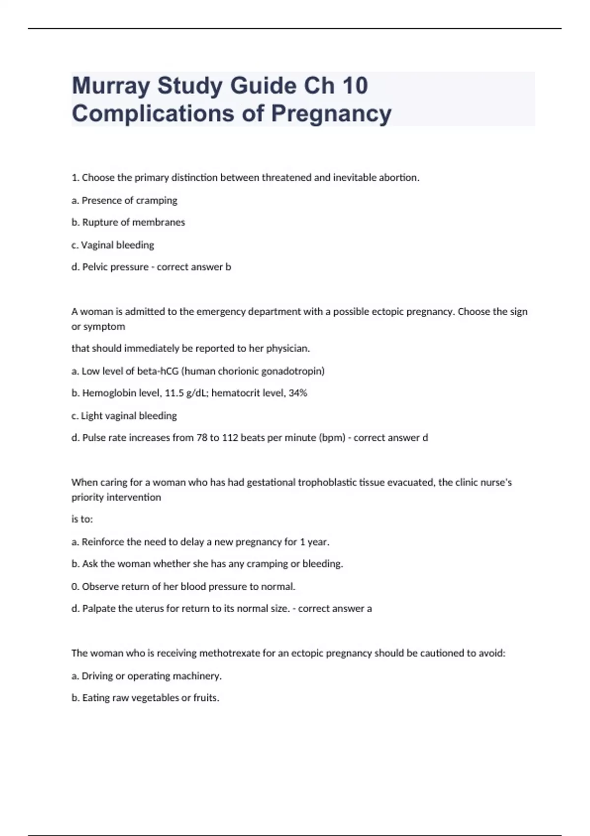 Murray Study Guide Ch 10 Complications of Pregnancy questions and answers rated A+ 2024