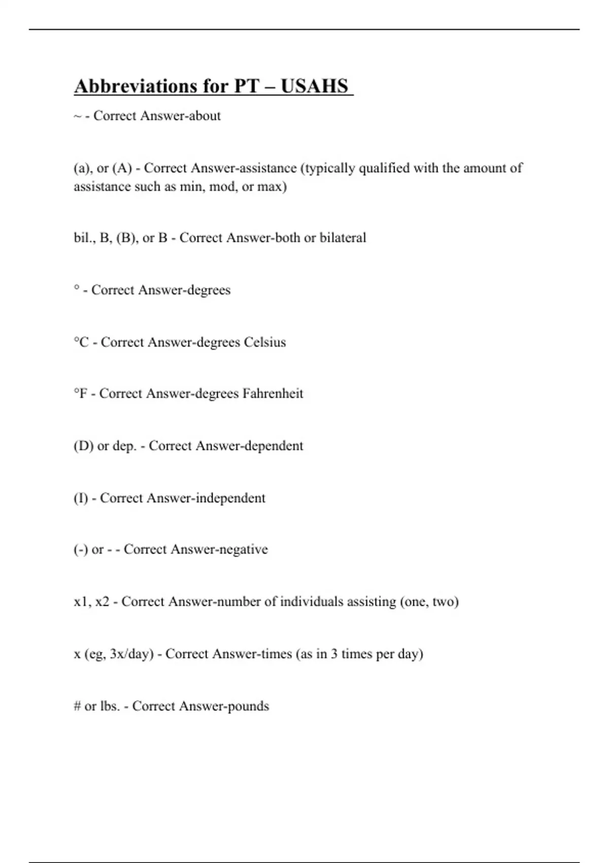 ~ - Correct Answer-about (a), or (A) - Correct Answer-assistance (typically qualified with the amount of assistance such as min, mod, or max) bil., B, (B), or B - Correct Answer-both or bilateral ° - Correct Answer-degrees °C - Correct Answer-degrees Celsius °F - Correct Answer-degrees Fahrenheit (D) or dep. - Correct Answer-dependent (I) - Correct Answer-independent (-) or - - Correct Answer-negative x1, x2 - Correct Answer-number of individuals assisting (one, two) x (eg, 3x/day) - Correct Answer-times (as in 3 times per day) # or lbs. - Correct Answer-pounds
