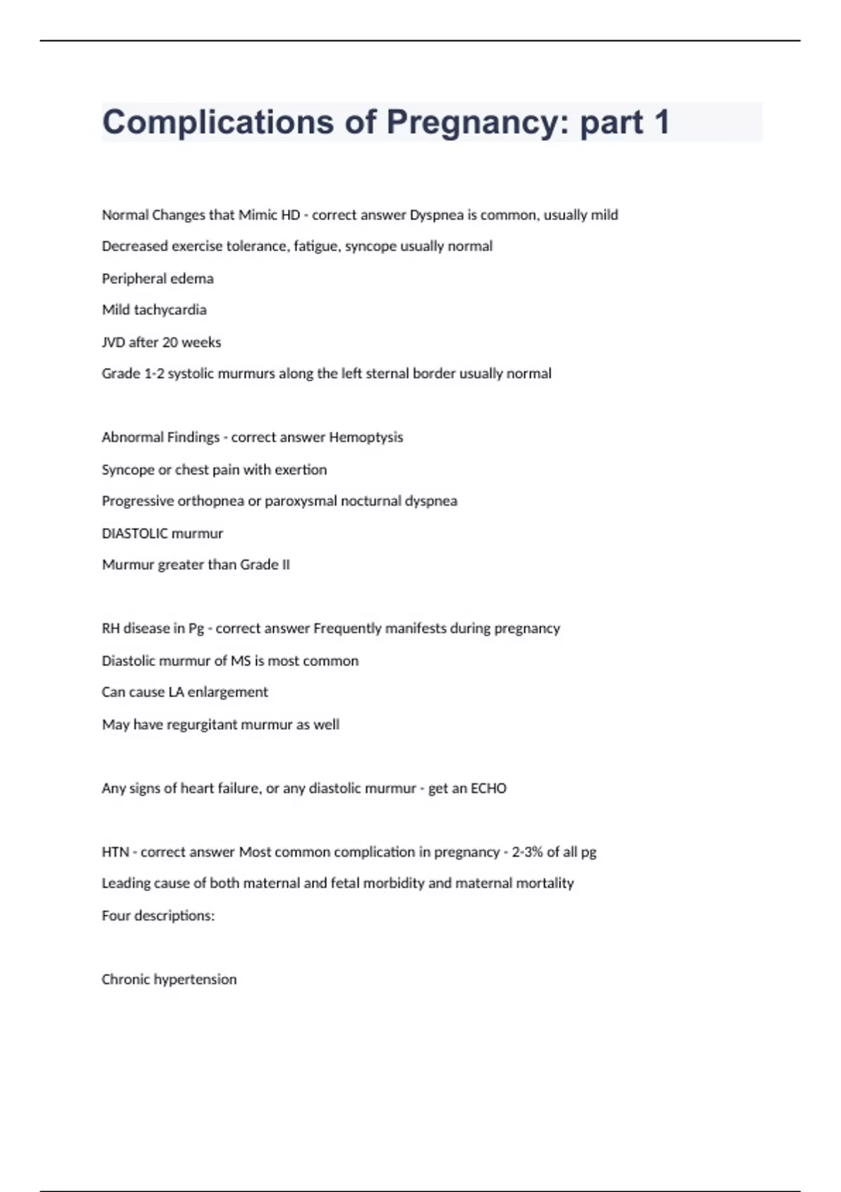 Complications of Pregnancy part 1 questions and answers verified 2024