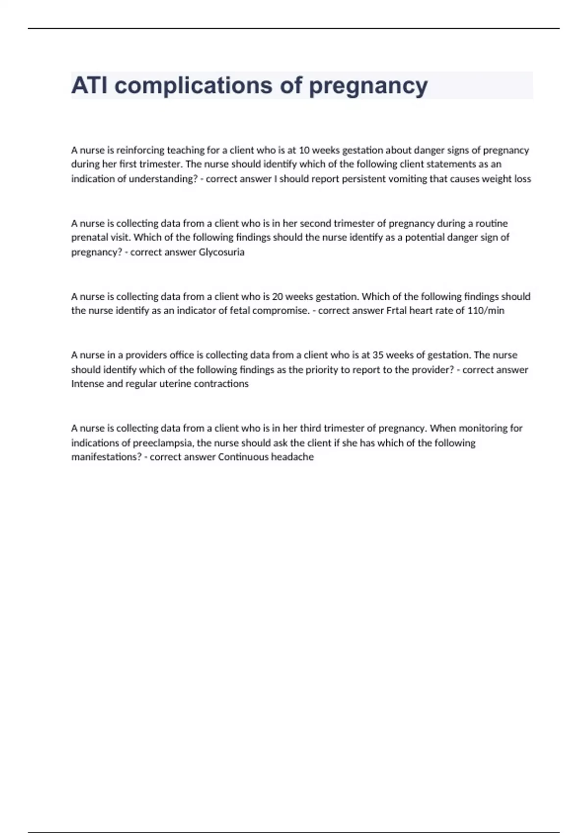 ATI complications of pregnancy questions and answers certified 2024