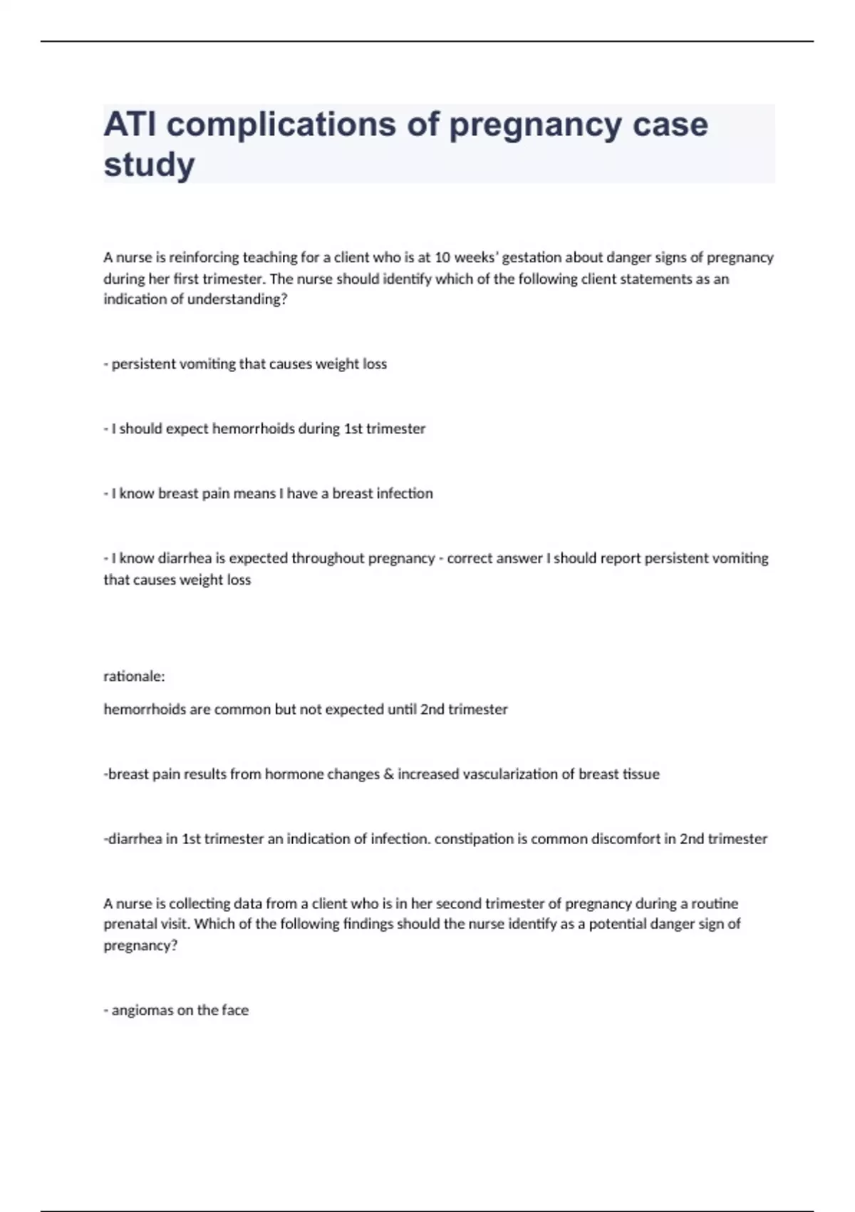 ATI complications of pregnancy case study questions and answers verified 2024